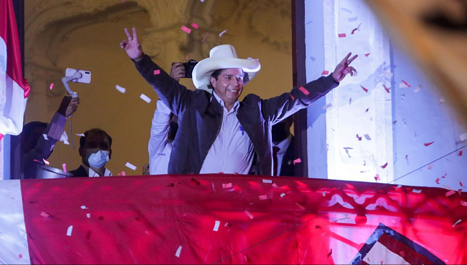 Image: Peru's presidential candidate Pedro Castillo addresses supporters from the headquarters of the "Free Peru" party in Lima, Peru, on June 15, 2021. Photo by Sebastian Castaneda/Reuters.