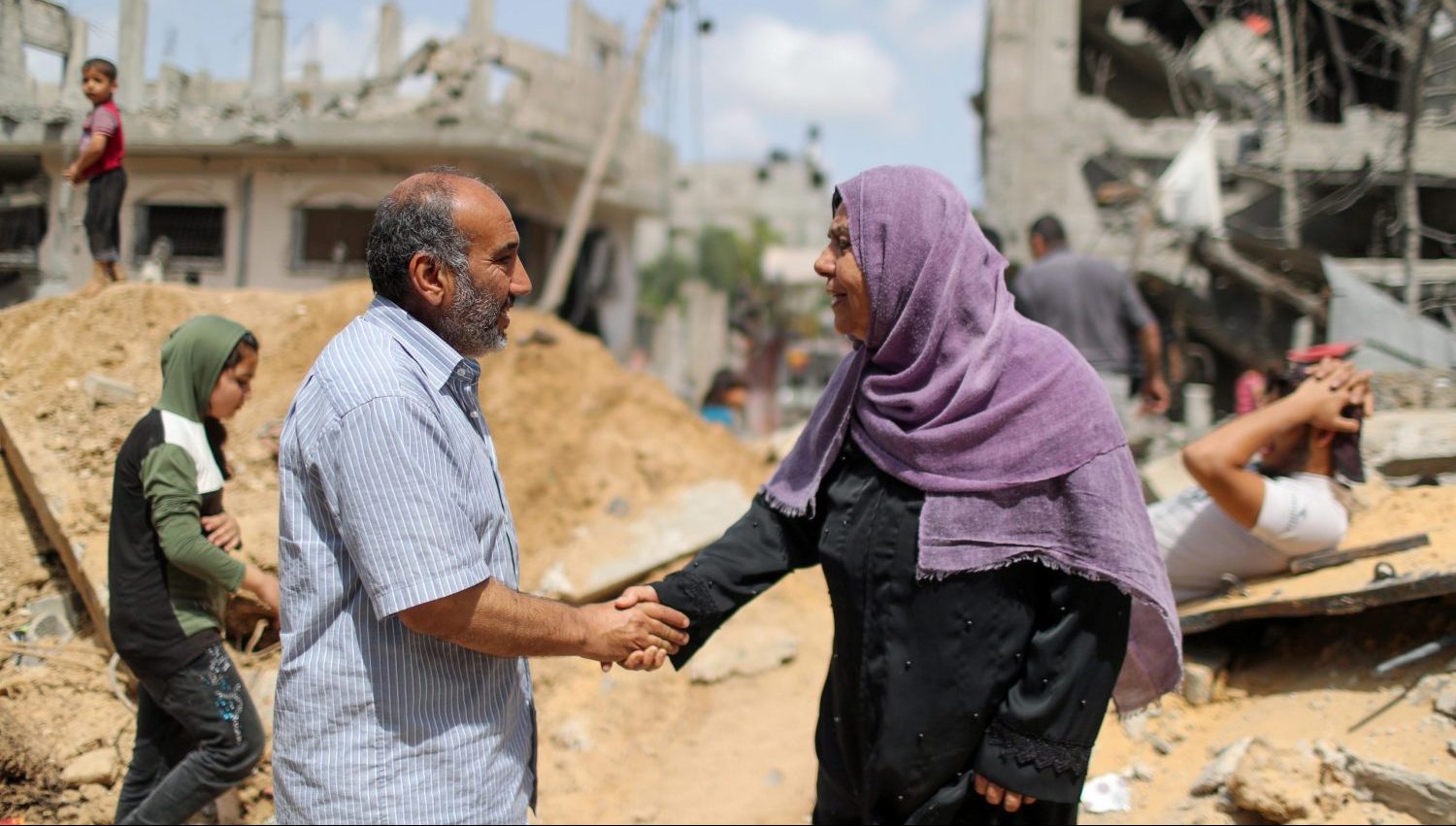 Image: Palestinians shake hands after returning to their destroyed houses following Israel- Hamas truce, in Beit Hanoun in the northern Gaza Strip, on May 21, 2021. Photo by Mohammed Salem/Reuters.
