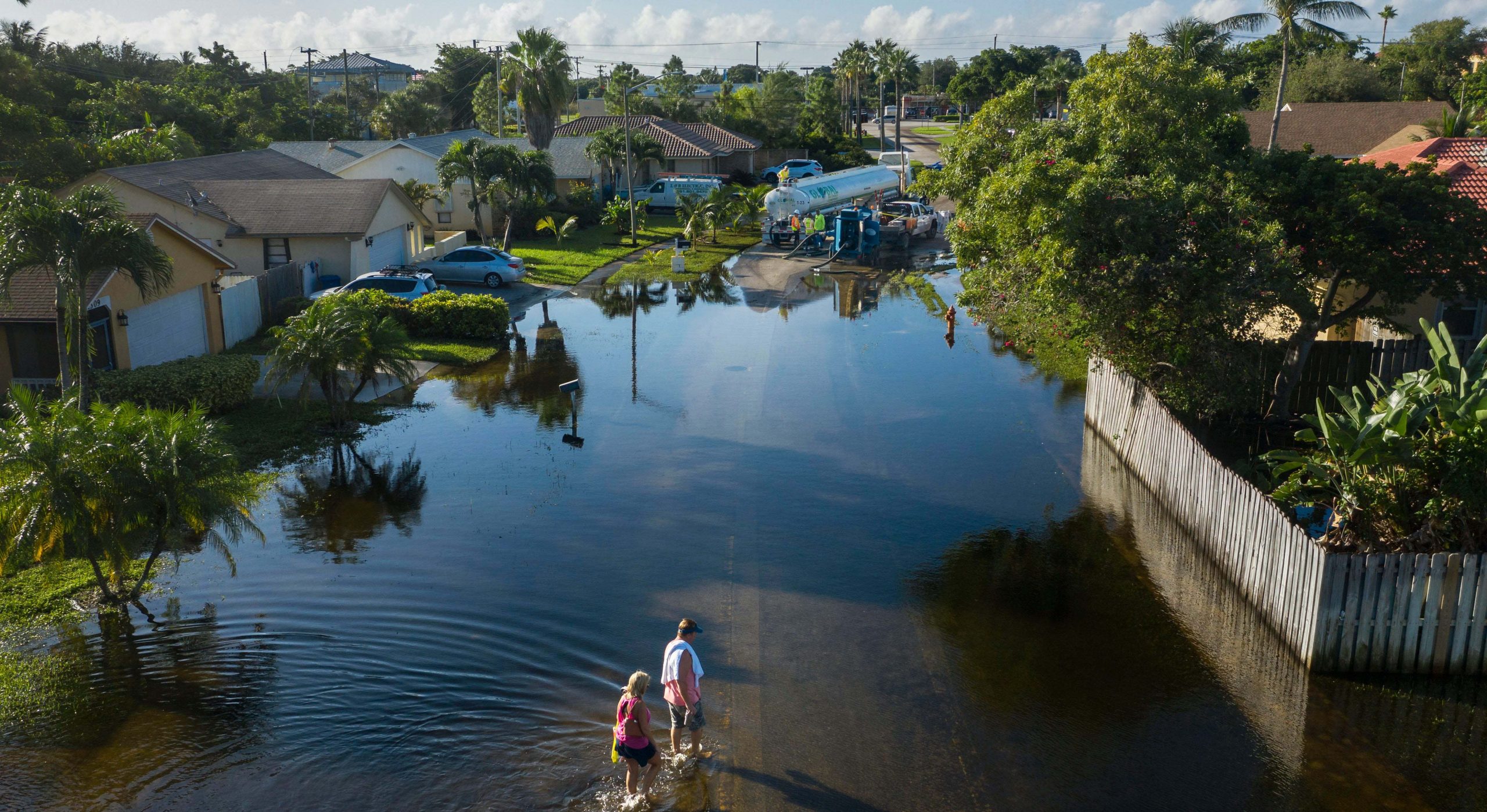 Image: Crews pump out flooded streets after heavy weekend rain flooded the Sea Pines neighborhood in Lantana, Florida on October 27, 2020. Crews continue to pump millions of gallons of water out of the development. [GREG LOVETT/palmbeachpost.com]B1 Cp Wpb 102920 Climate 01