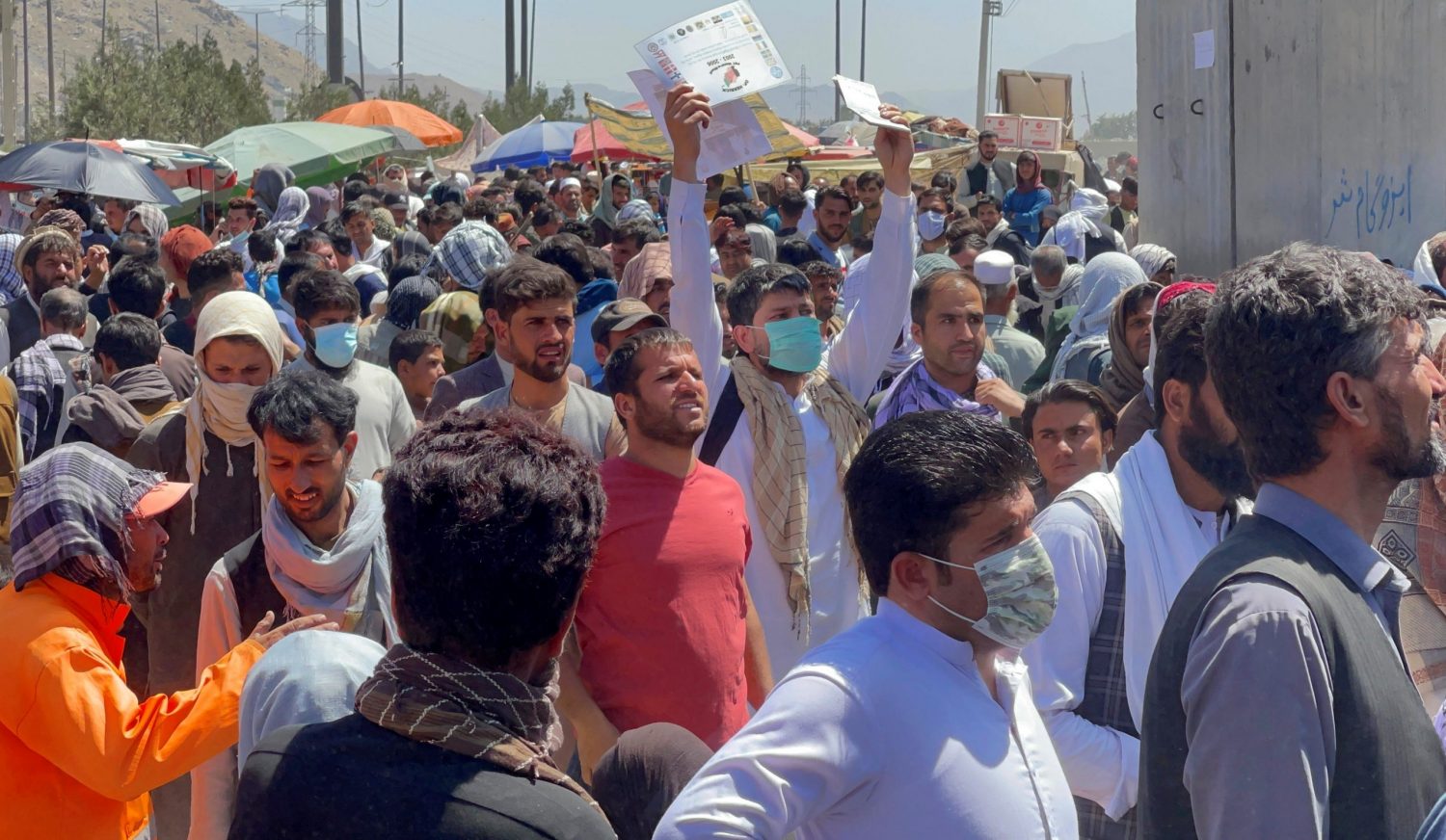 Image: Crowds of people show their documents to US troops outside the airport in Kabul, Afghanistan, on August 26, 2021. Photo by a Reuters stringer.