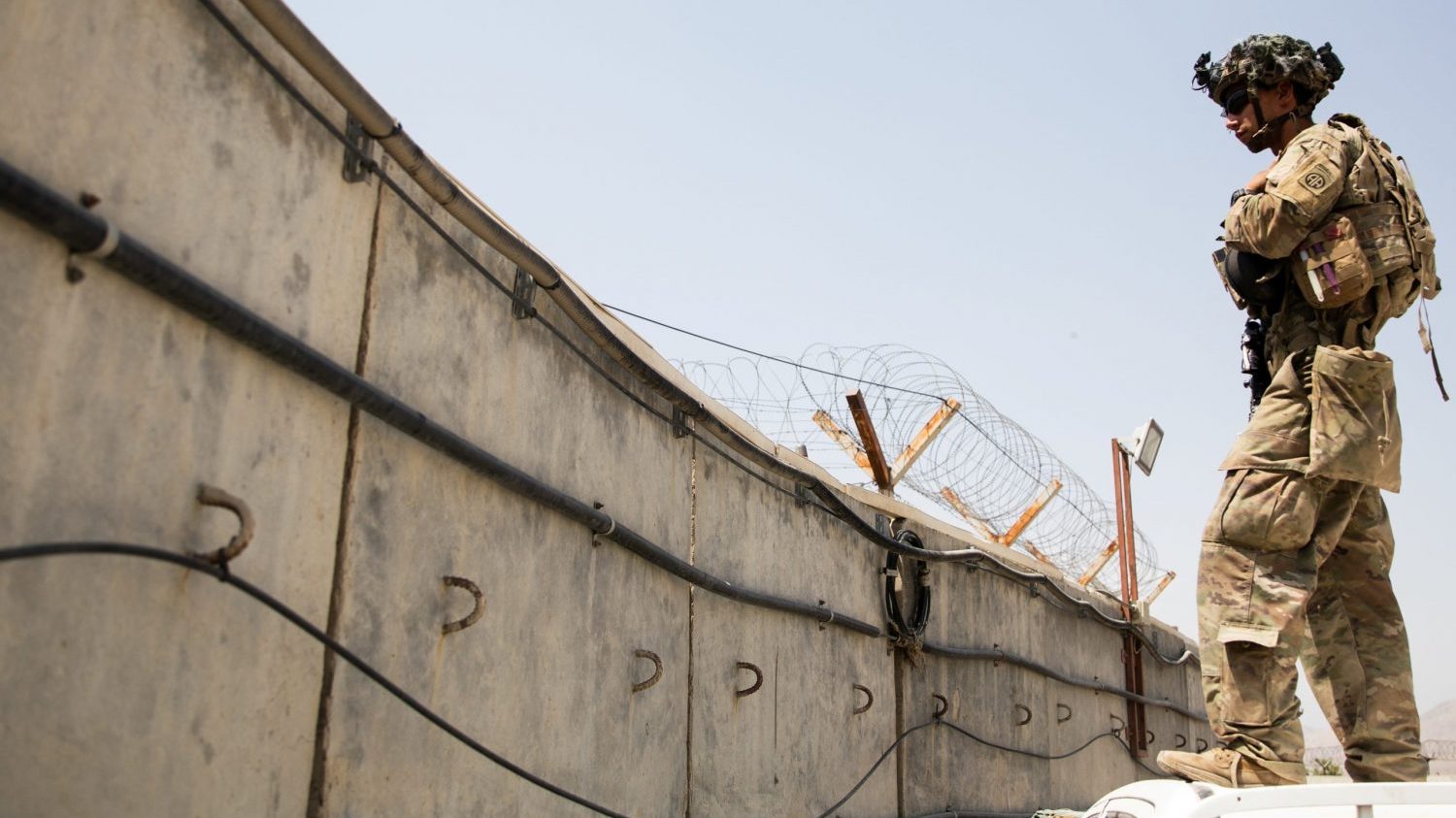 Image: A Paratrooper assigned to the 82nd Airborne Division conducts security as evacuations continued at Hamid Karzai International Airport in Kabul, Afghanistan, on August 29, 2021. Photo by US Army/Master Sgt. Alexander Burnett via Reuters.