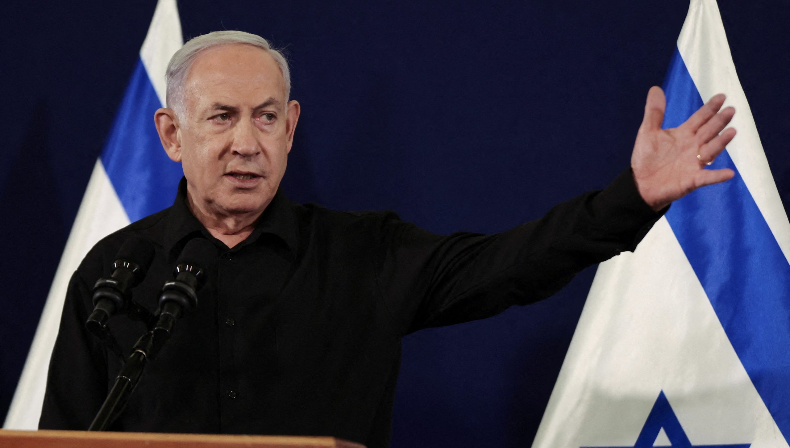 Image: Israeli Prime Minister Benjamin Netanyahu holds a press conference with Defense Minister Yoav Gallant and Cabinet Minister Benny Gantz (not pictured) in the Kirya military base in Tel Aviv , Israel , 28 October 2023. ABIR SULTAN POOL/Pool via REUTERS