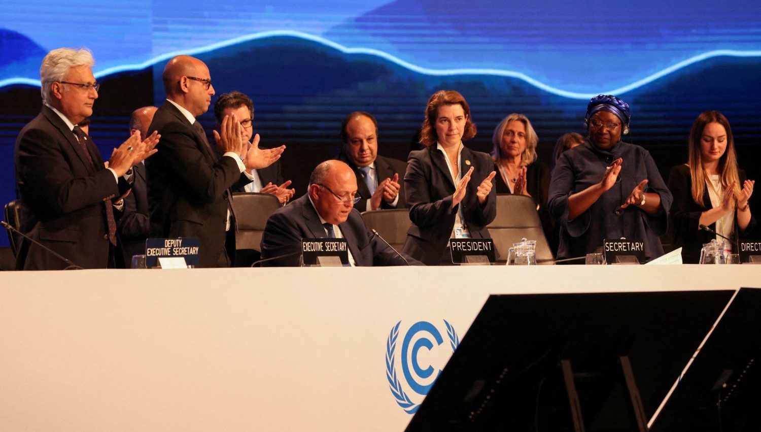 Image: Delegates applaud as COP27 President Sameh Shoukry delivers a statement during the closing plenary at the COP27 climate summit in Red Sea resort of Sharm el-Sheikh, Egypt, November 20, 2022. REUTERS/Mohamed Abd El Ghany