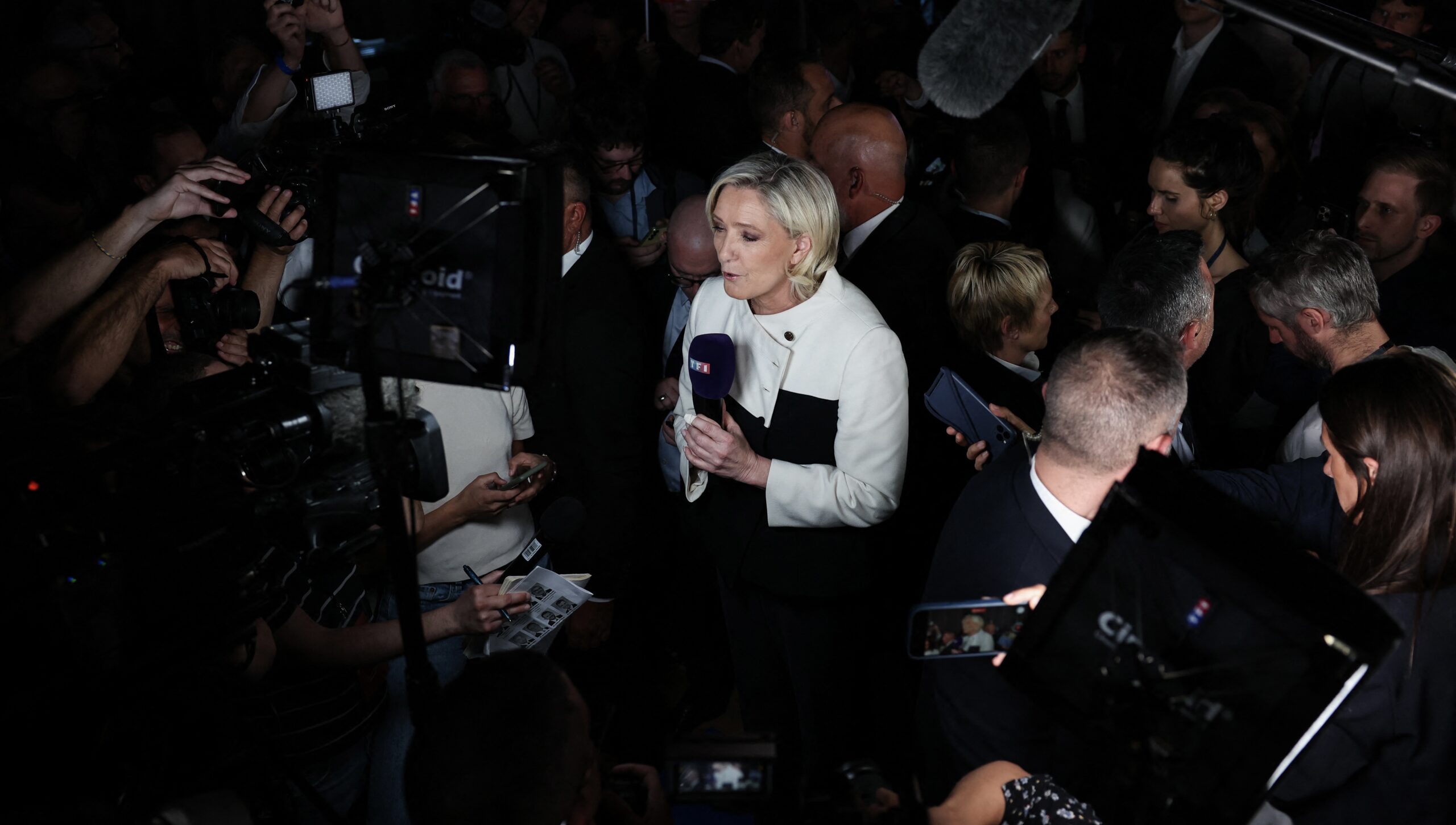 Image: French far-right leader Marine Le Pen talks to journalists after partial results in the second round of the early French parliamentary elections in Paris, France, July 7, 2024. REUTERS/Kevin Coombs