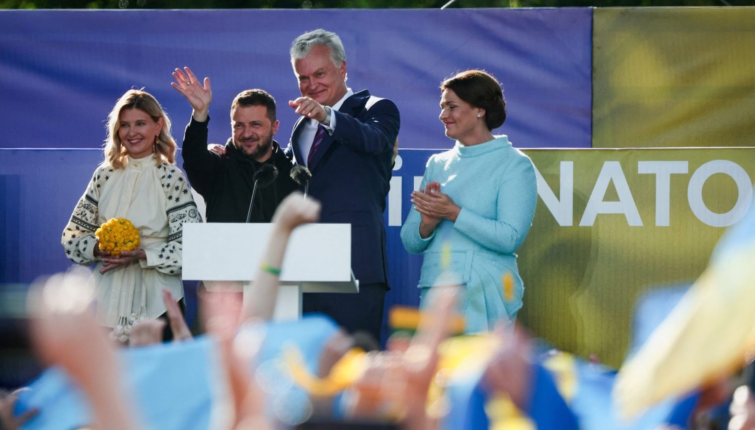 Image: Ukrainian President Volodymyr Zelenskiy, his wife Olena Zelenska, Lithuanian President Gitanas Nauseda and his wife Diana Nausediene attend a ceremony during which a Ukrainian flag from the frontline of the war with Russia is delivered by activists, on the sidelines of a NATO leaders summit in Vilnius, Lithuania July 11, 2023. REUTERS/Kacper Pempel