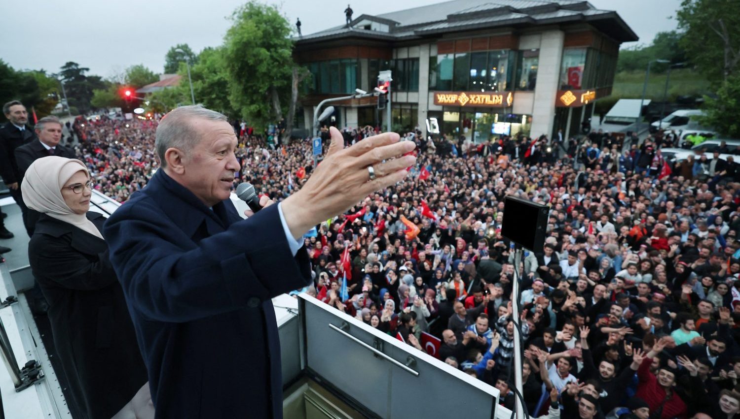 Image: Turkish President Tayyip Erdogan, accompanied by his wife Emine Erdogan, addresses his supporters following early exit poll results for the second round of the presidential election in Istanbul, Turkey May 28, 2023. Murat Cetinmuhurdar/Presidential Press Office/Handout via REUTERS ATTENTION EDITORS - THIS PICTURE WAS PROVIDED BY A THIRD PARTY. NO RESALES. NO ARCHIVES.