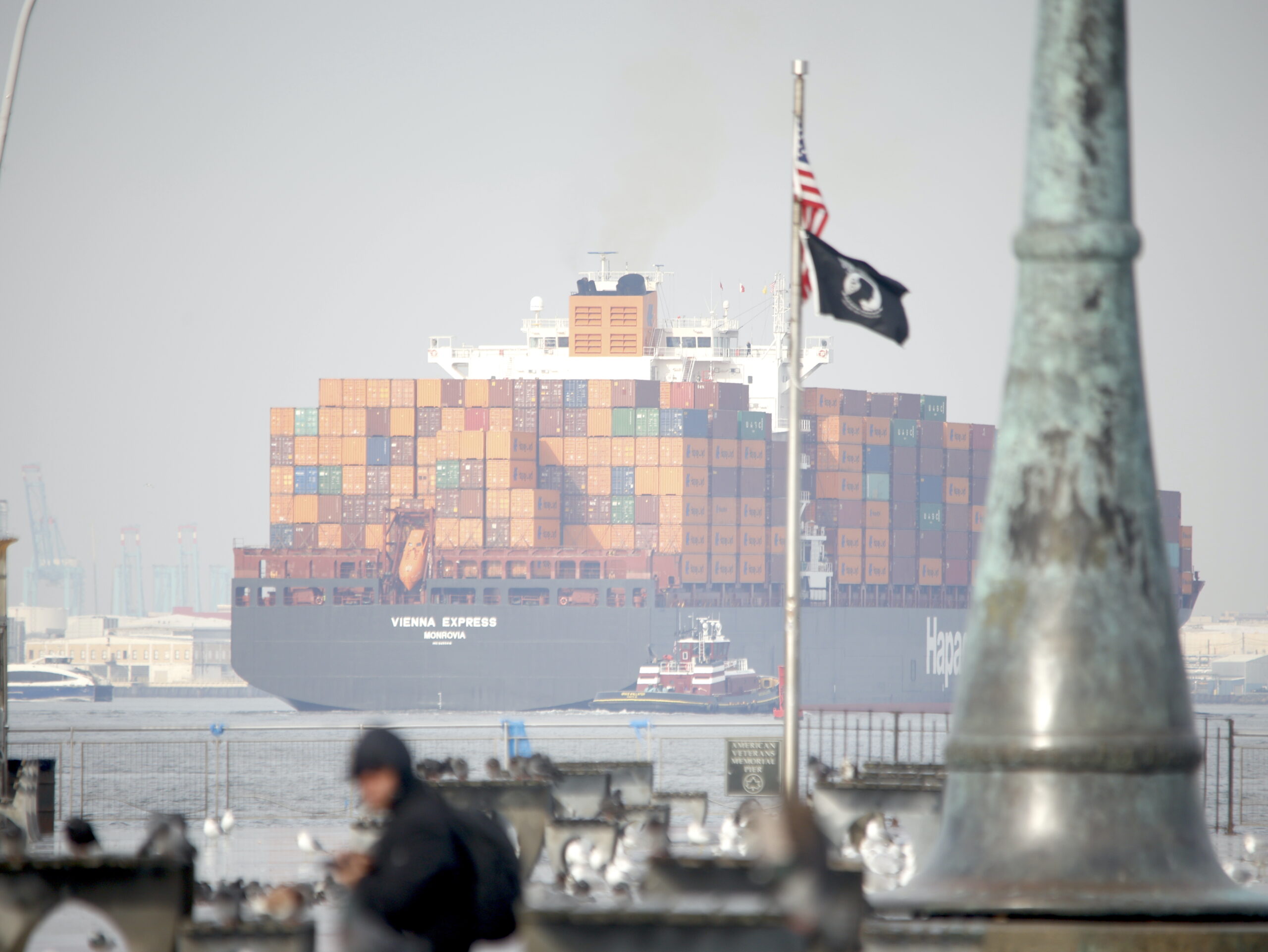 Image: Container ships enter the Port of New Jersey in New Jersey, United States, on February 3, 2025. U.S. import products could increase by 25% in tariffs from Canada, Mexico, and China. Mexico faces a 25% tariff, while Canada is charged 25% on its imports to the United States and 10% on its energy products. China faces an additional 10% tariff because of its role in the manufacture and sale of fentanyl, according to Trump's White House. President Donald Trump confirms that planned tariffs on Mexico are suspended for 30 days. (Photo by Deccio Serrano/NurPhoto)NO USE FRANCE