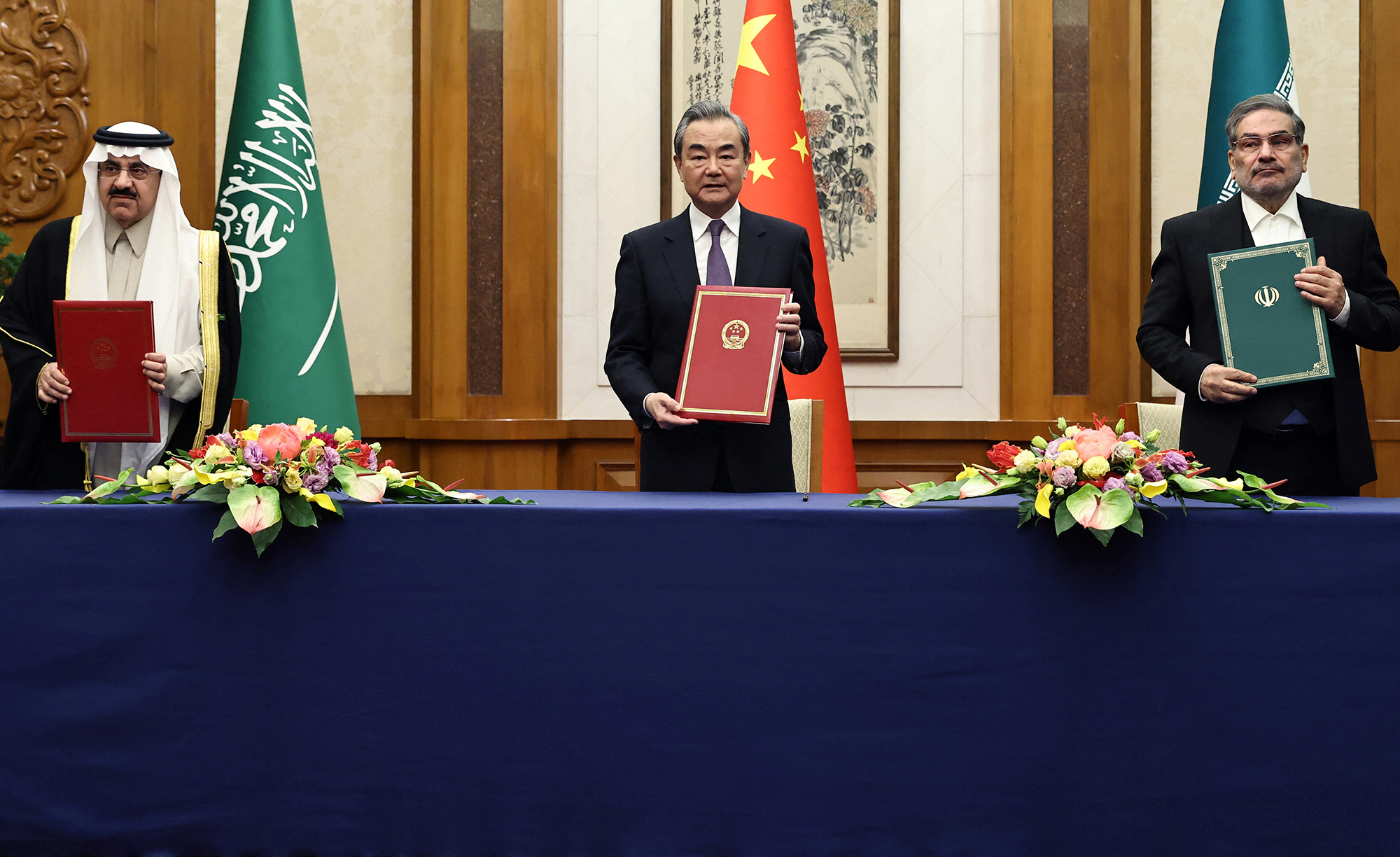 Image: Wang Yi, a member of the Political Bureau of the Communist Party of China (CPC) Central Committee and director of the Office of the Central Foreign Affairs Commission attends a meeting with Secretary of Iran's Supreme National Security Council Ali Shamkhani and Minister of State and national security adviser of Saudi Arabia Musaad bin Mohammed Al Aiban in Beijing, China March 10, 2023. Photo via China Daily via REUTERS.