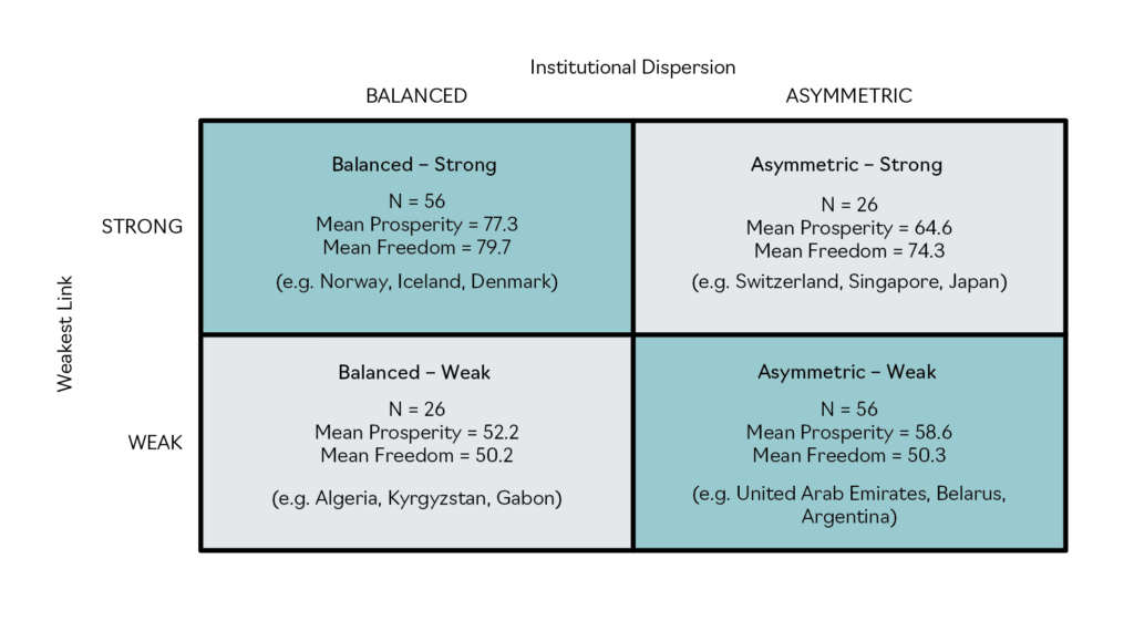 First, countries with a strong institutional floor—those in the upper half of the typology—achieve substantially higher prosperity levels than those whose weakest pillar falls below the median. The gap between Asymmetric–Strong and Asymmetric–Weak alone is roughly six to seven index points, suggesting that minimum institutional performance is closely associated with aggregate outcomes.