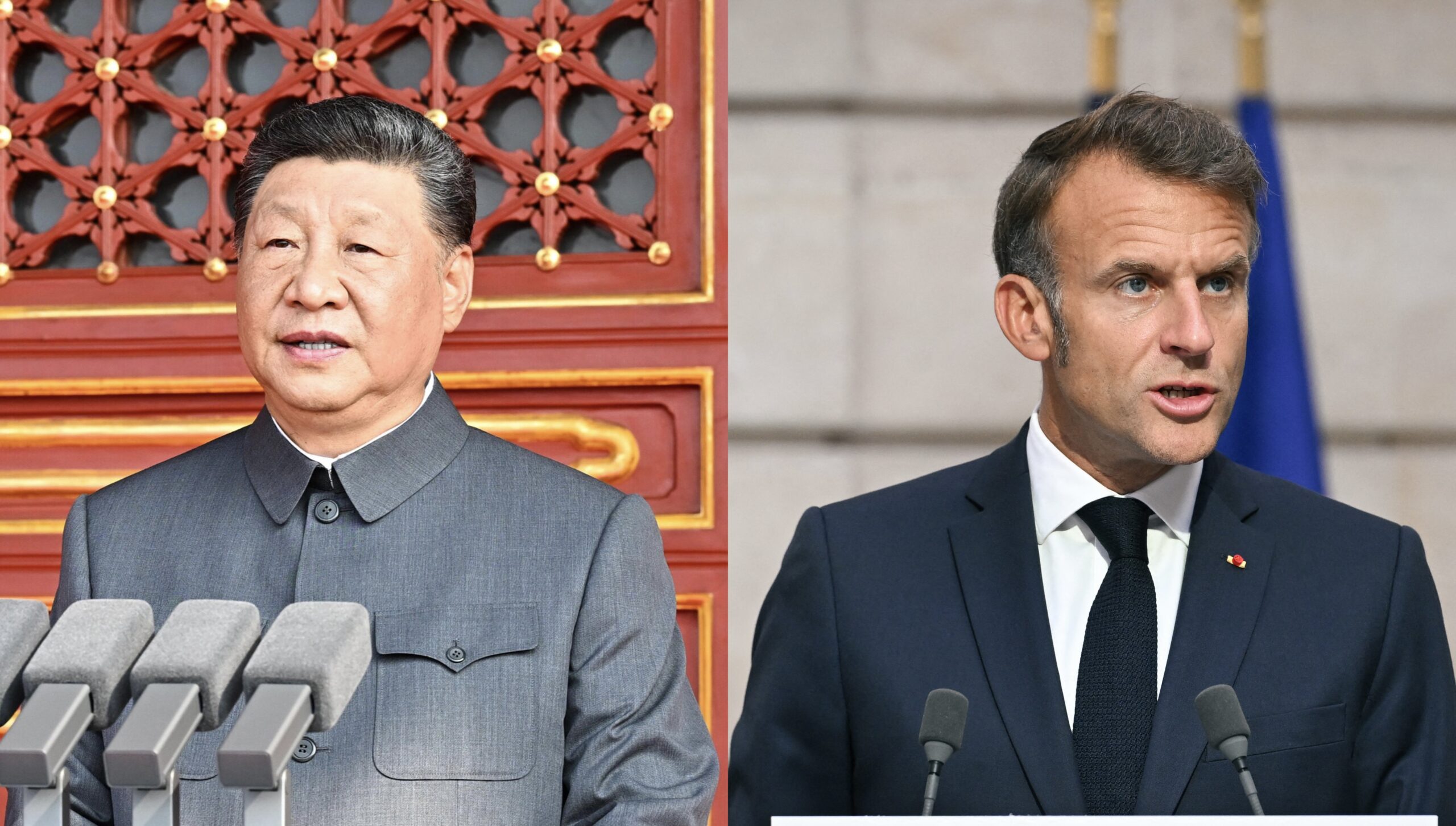 Image: A composite of China President Xi Jinping addressing a military parade marking the 80th anniversary of victory over Japan and the end of World War II, in Beijing on September 3, 2025. (China Foreign Ministry handout) and French President Emmanuel Macron speaking during a joint press conference with Ukraine's President Volodymyr Zelensky following the Coalition of the Willing Summit, at the Elysee presidential Palace, in Paris, France on September 4, 2025. LUDOVIC MARIN/Pool via REUTERS