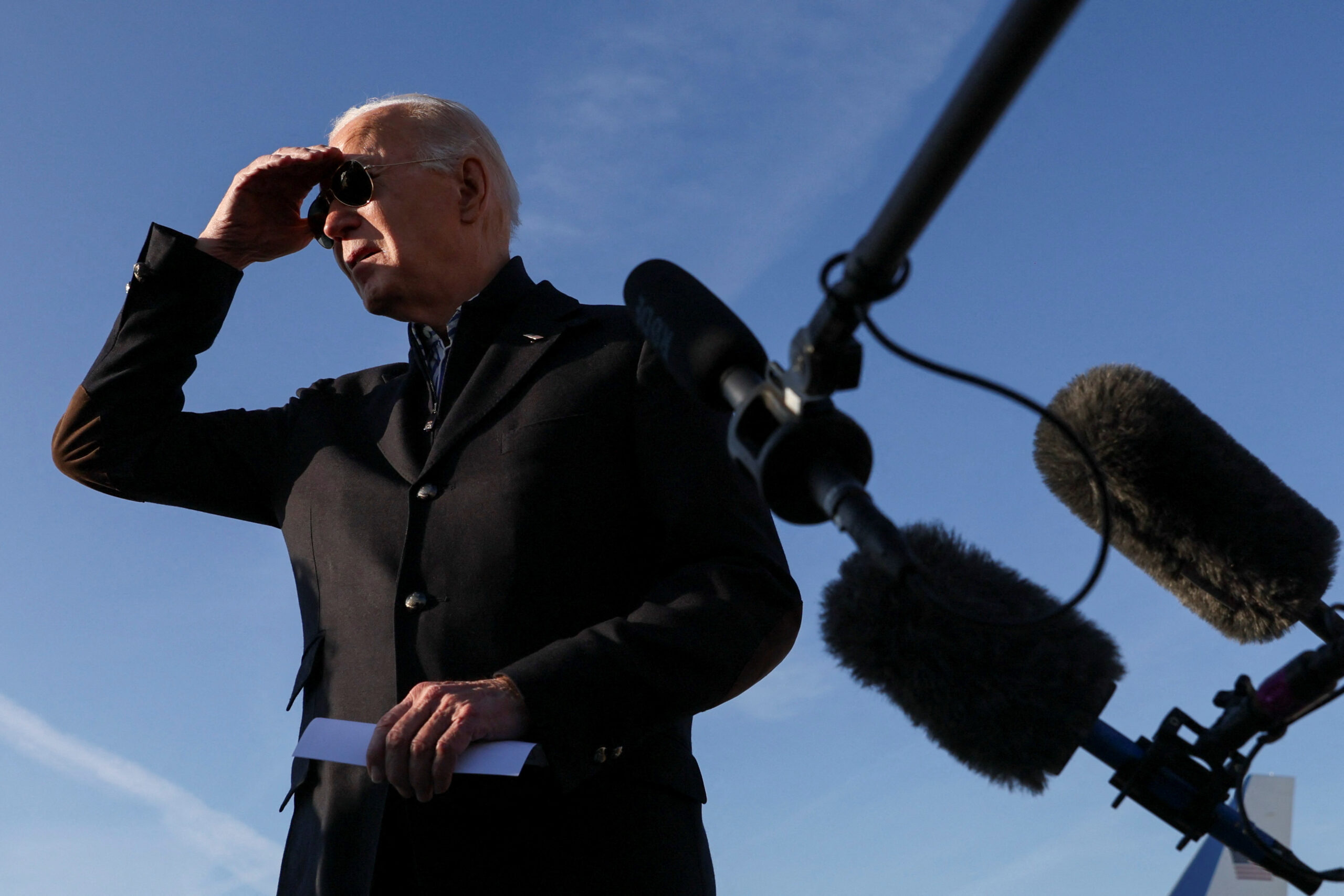 Image: U.S. President Joe Biden gestures as he speaks to media before departing from the Milwaukee Mitchell International Airport, Wisconsin, U.S., December 20, 2023. REUTERS/Leah Millis