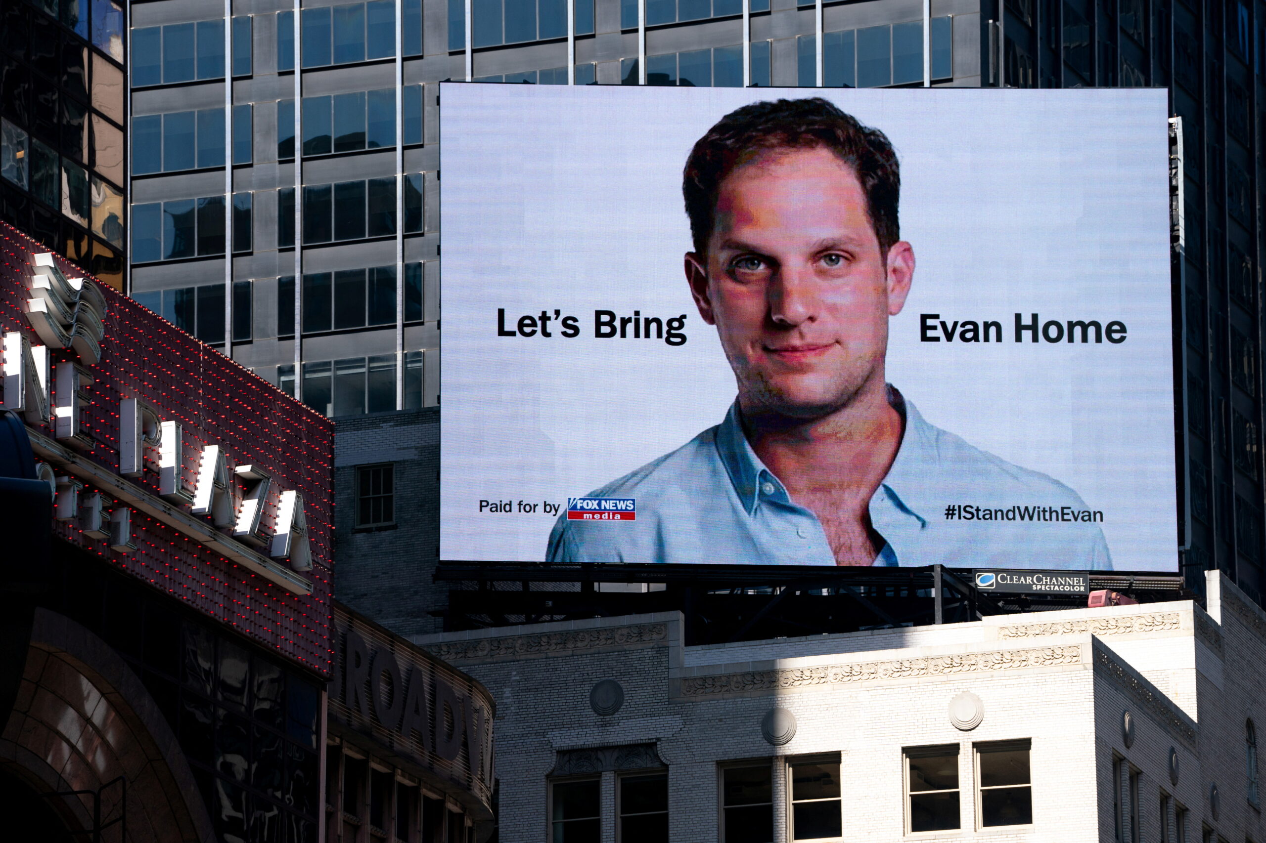 Image: One year since Evan Gershkovich's arrest, a billboard in Times Square, calls for the release of the Wall Street Journal reporter held in Russia, in New York City, U.S., March 29, 2024. REUTERS/David 'Dee' Delgado