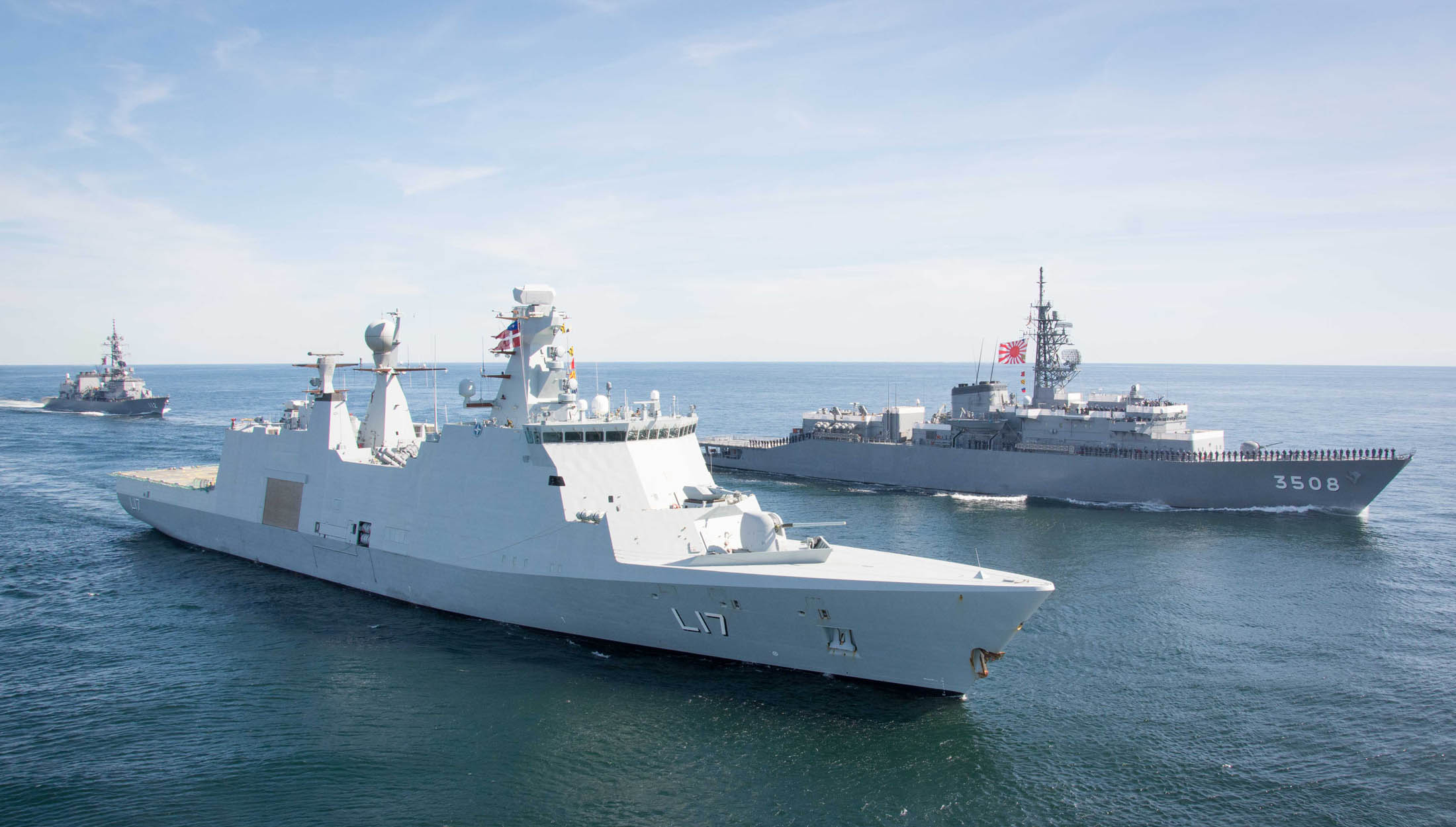 Image: SNMG1 flagship sailing with Japan Maritime Self Defense Force Training Squadron ships (JMSDF cadet training vessel JS Kashima and the destroyer JS Makinamiin) the Baltic Sea during a Passing Exercise (PASSEX).