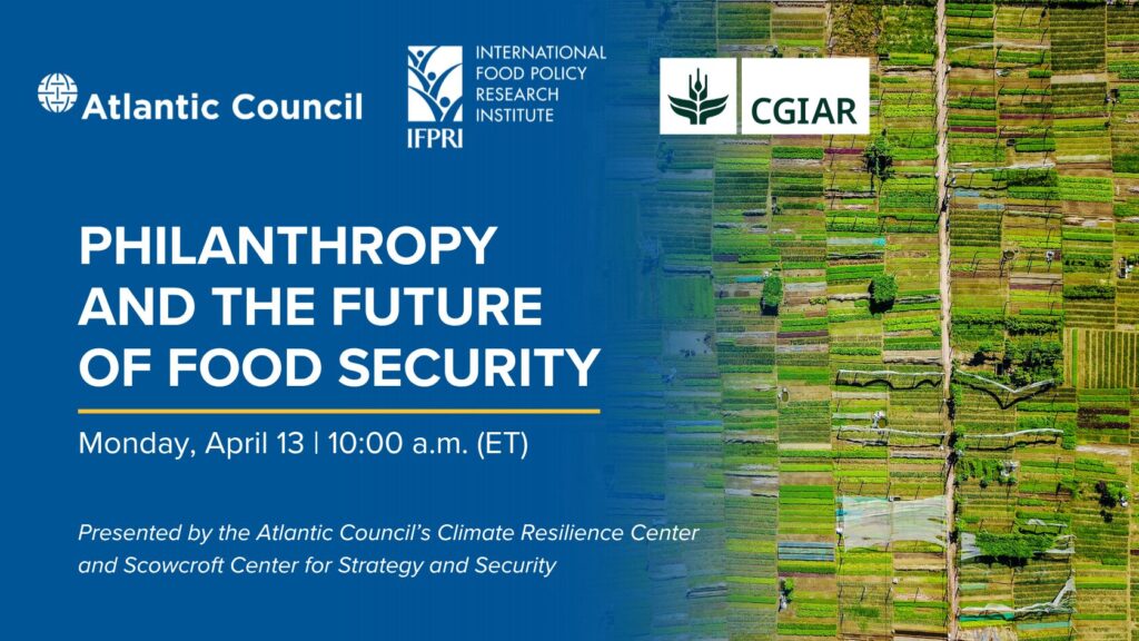 On Monday, April 13 at 10:00 a.m ET, the Atlantic Council’s Climate Resilience Center and Scowcroft Center for Strategy and Security will host a panel conversation on philanthropy’s role in food security in partnership with CGIAR and the International Food Policy Research Institute.