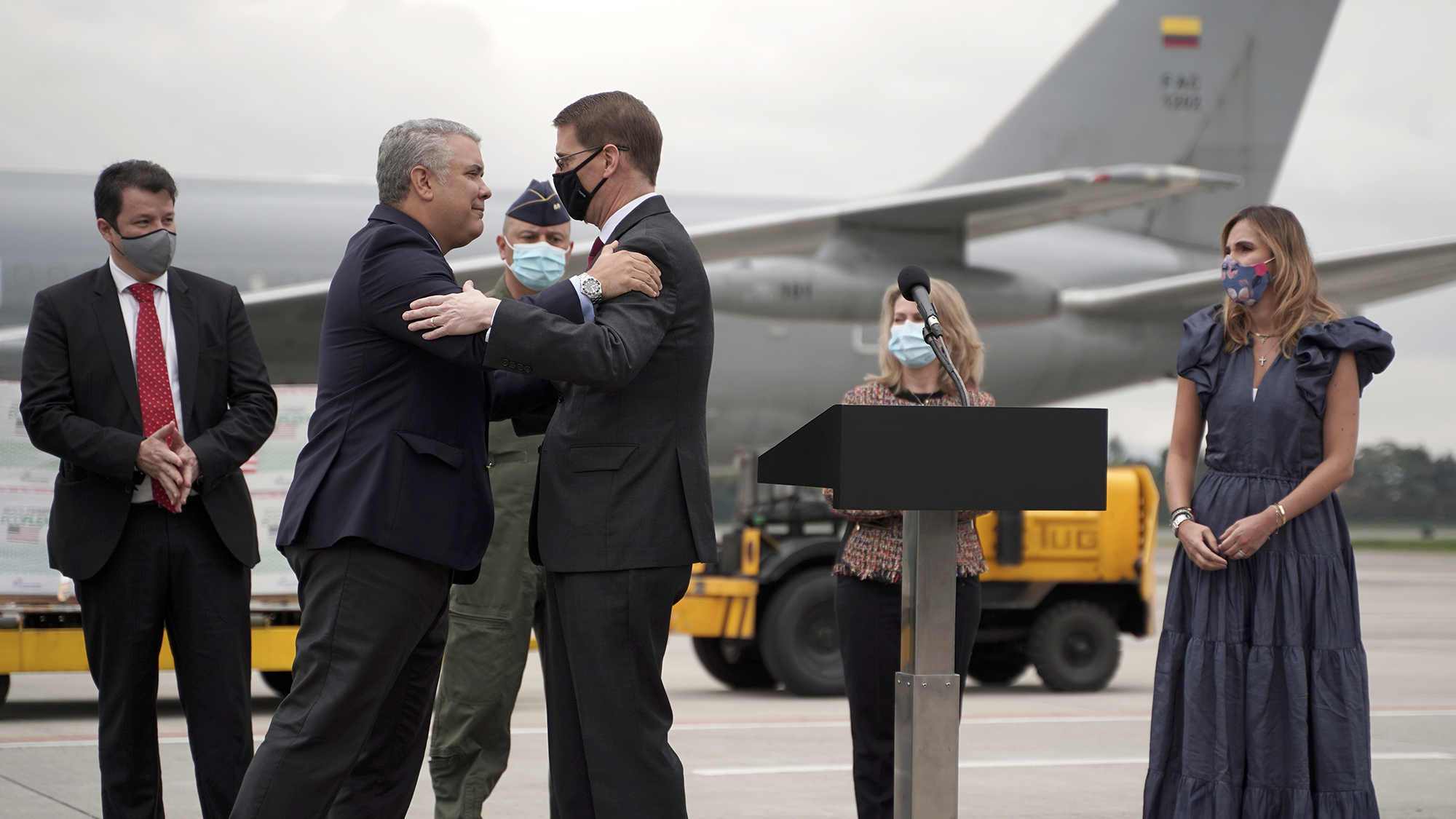 Image: Colombia's President Ivan Duque and Mark Wells, US Embassy Deputy Chief of Mission in Colombia, react as they attend the arrival of a shipment of Johnson & Johnson vaccines against the coronavirus disease in Bogota, Colombia on July 1, 2021. Photo via REUTERS/Nathalia Angarita.