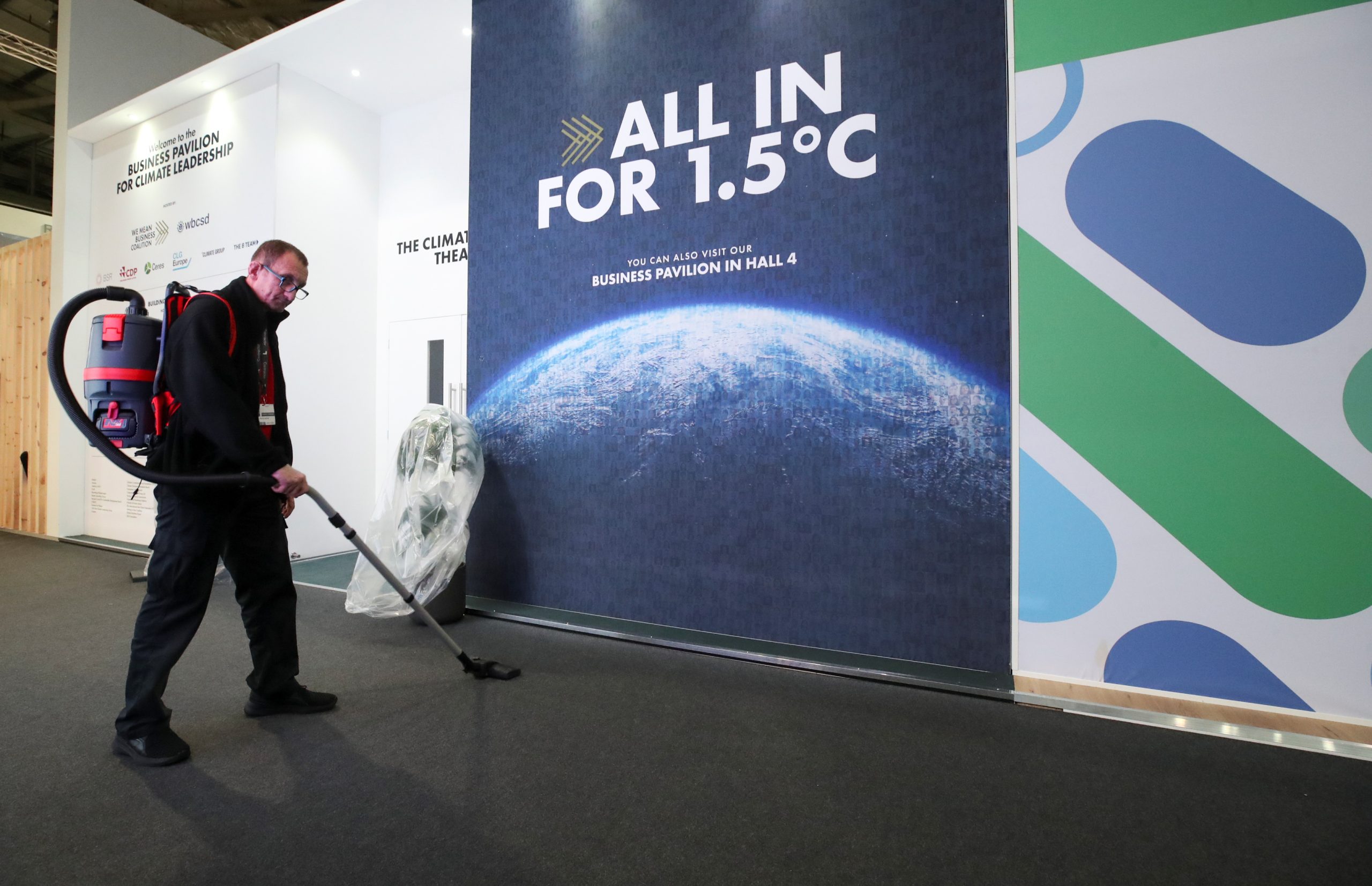 Image: A worker is vacuuming the floor at the venue of the UN Climate Change Conference (COP26) in Glasgow, Scotland, Britain November 12, 2021. REUTERS/Yves Herman