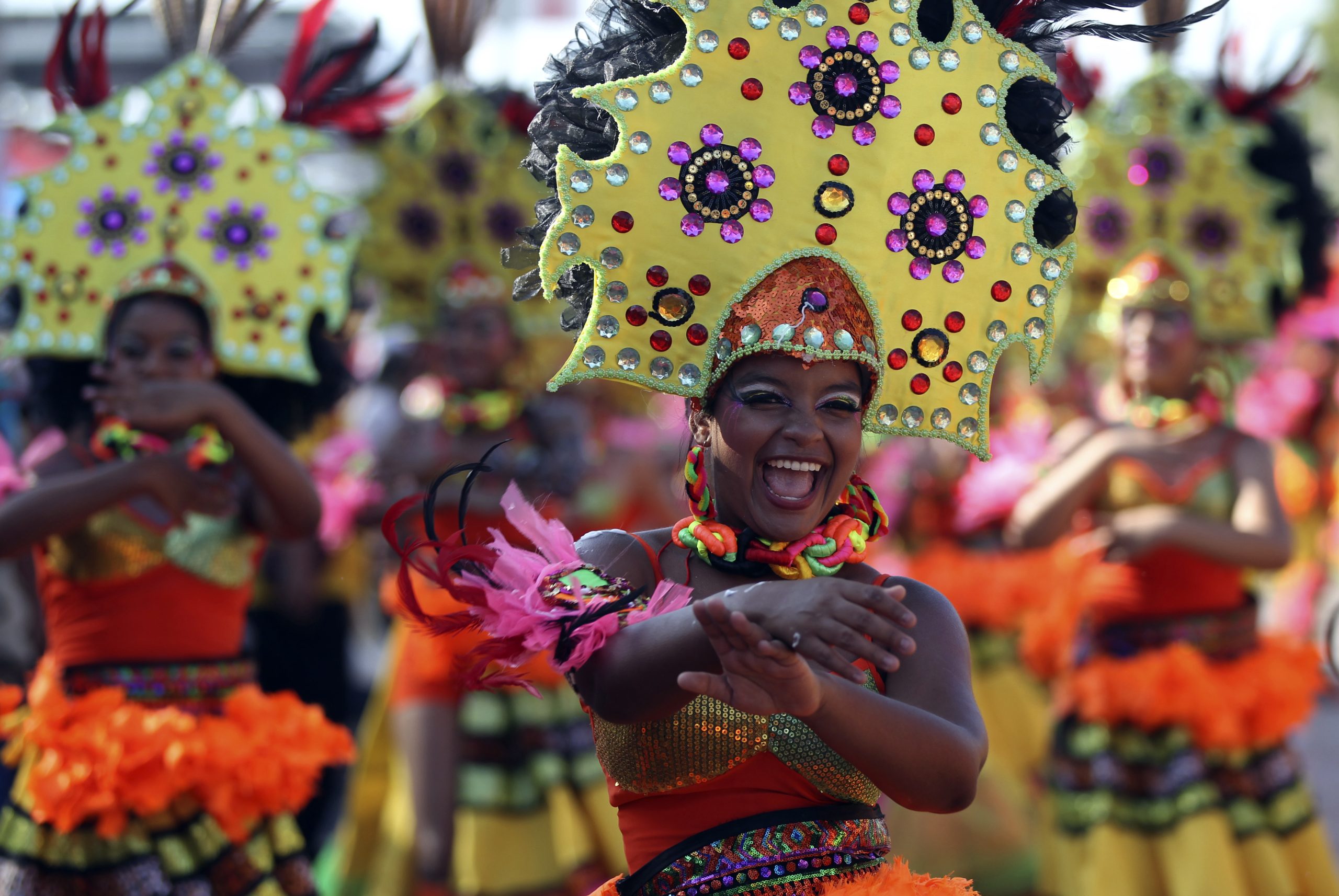 Image: "Klama" dancers perform during the "Battles of the Flowers" parade as part of carnival celebrations in Barranquilla March 1, 2014. REUTERS/John Vizcaino (COLOMBIA - Tags: SOCIETY)