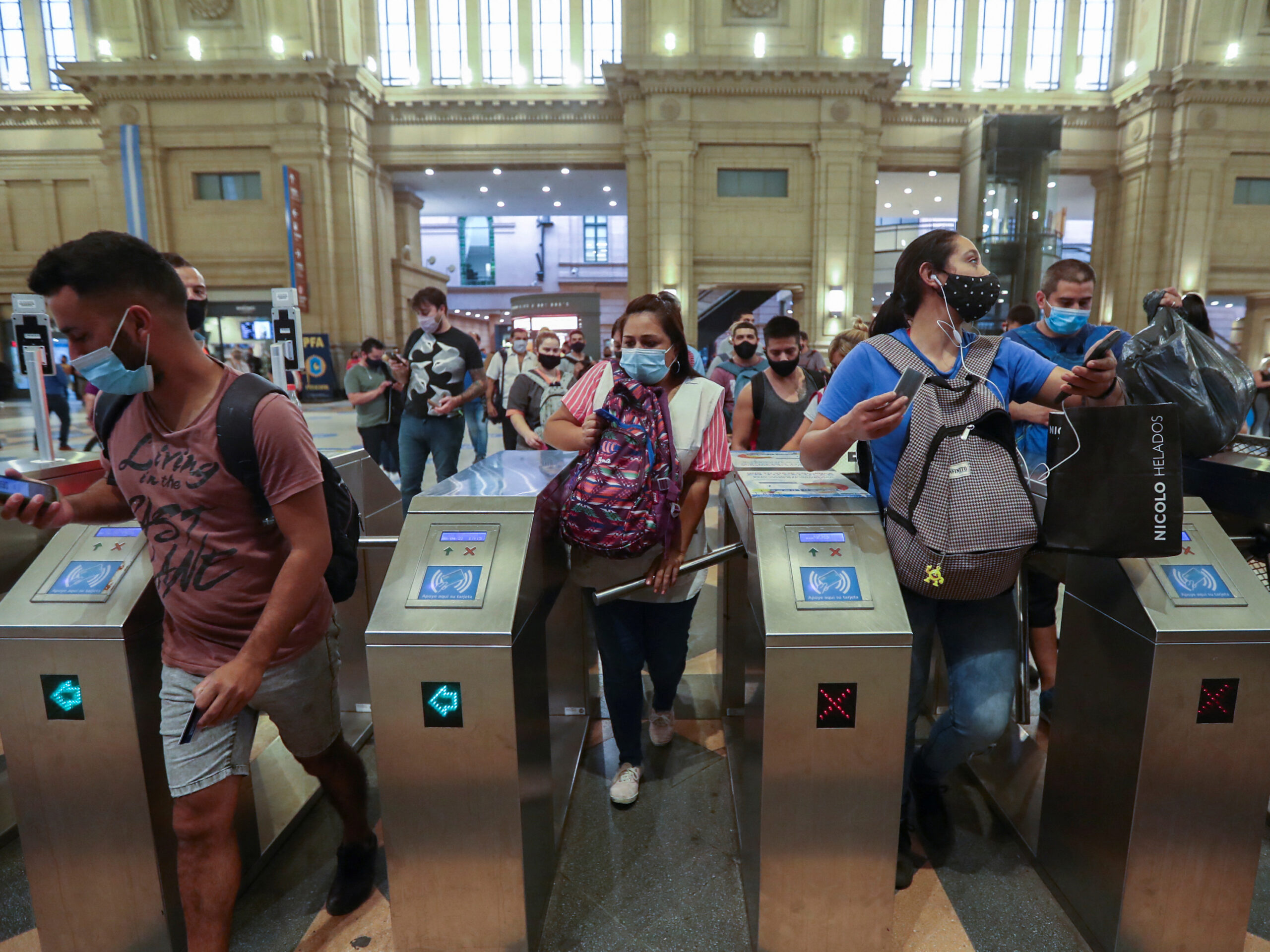 Image: Commuters walk trough ticket machines at Constitucion train station, amid a rise in cases of the coronavirus disease (COVID-19), in Buenos Aires, Argentina April 8, 2021. REUTERS/Agustin Marcarian