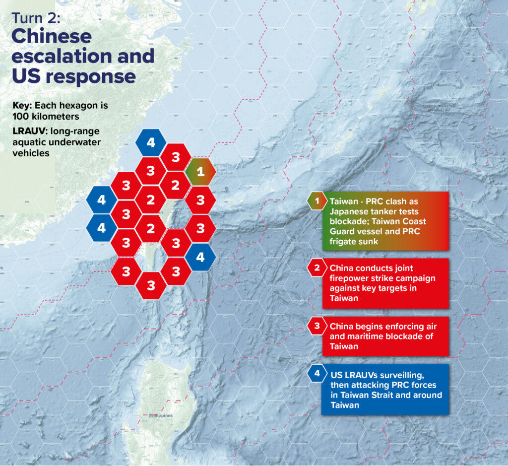 In the second turn of the wargame, the situation rapidly escalated as Chinese coast guard vessels attempted to enforce the quarantine and Taiwanese coast guard vessels moved to escort incoming ships. Chinese military vessels intervened, with a People’s Republic of China (PRC) frigate sinking one of Taiwan’s coast guard vessels. A short time later, this frigate exploded and sank quickly, apparently hit by a torpedo or unmanned underwater vehicle.