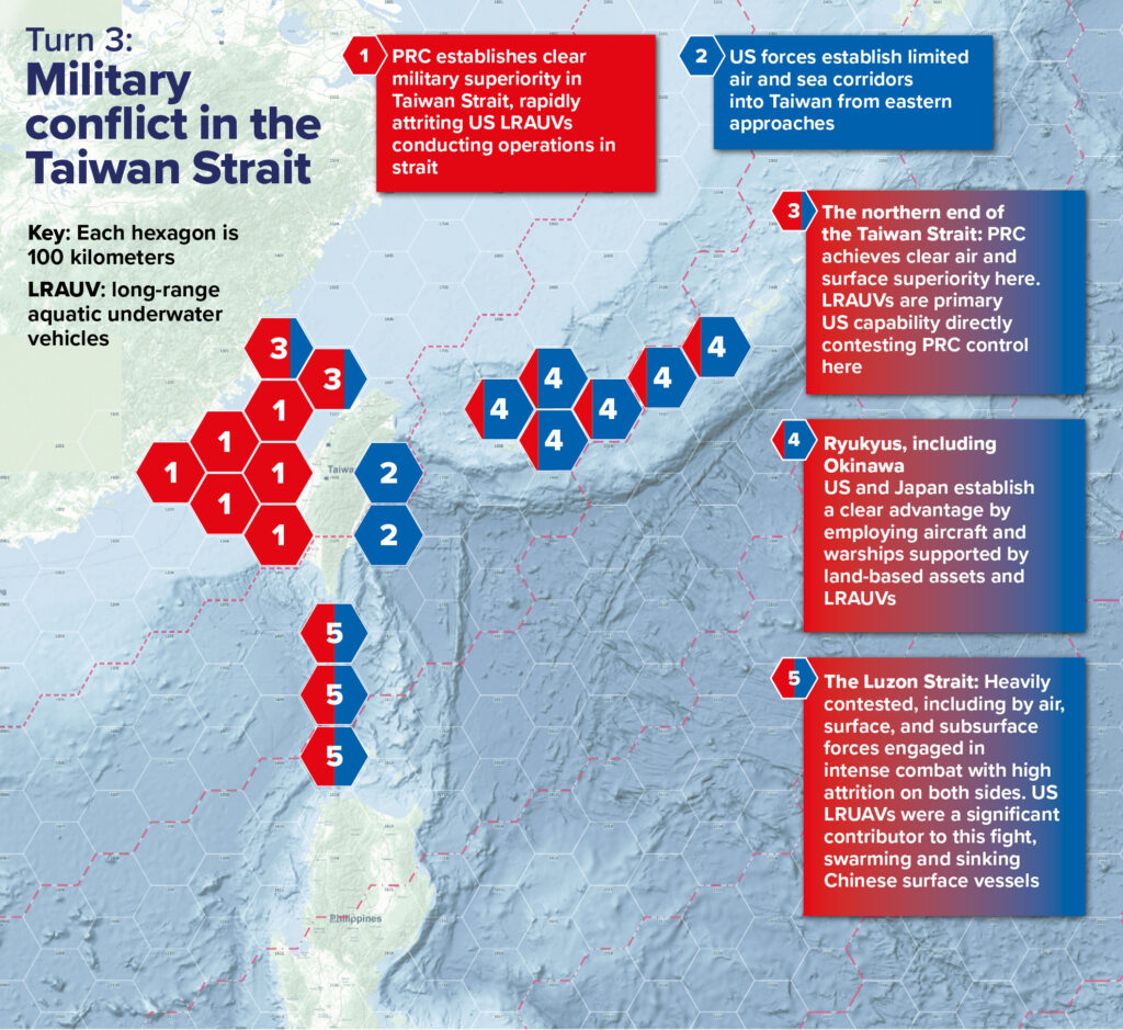 China successfully established clear maritime superiority in the Taiwan Strait despite some US LRAUVs entering. The control team, based on analysis of China’s countermeasures, adjudicated that China was able to take advantage of the geographic constriction and relatively shallow waters of the strait to detect, disable, and destroy the LRAUVs through various means faster than replacement LRAUVs could enter the strait through the passages at its north and south ends. China was also able to disrupt and interdict much of the air and maritime traffic coming into Taiwan from the east, particularly given the limited east coast port capacity.