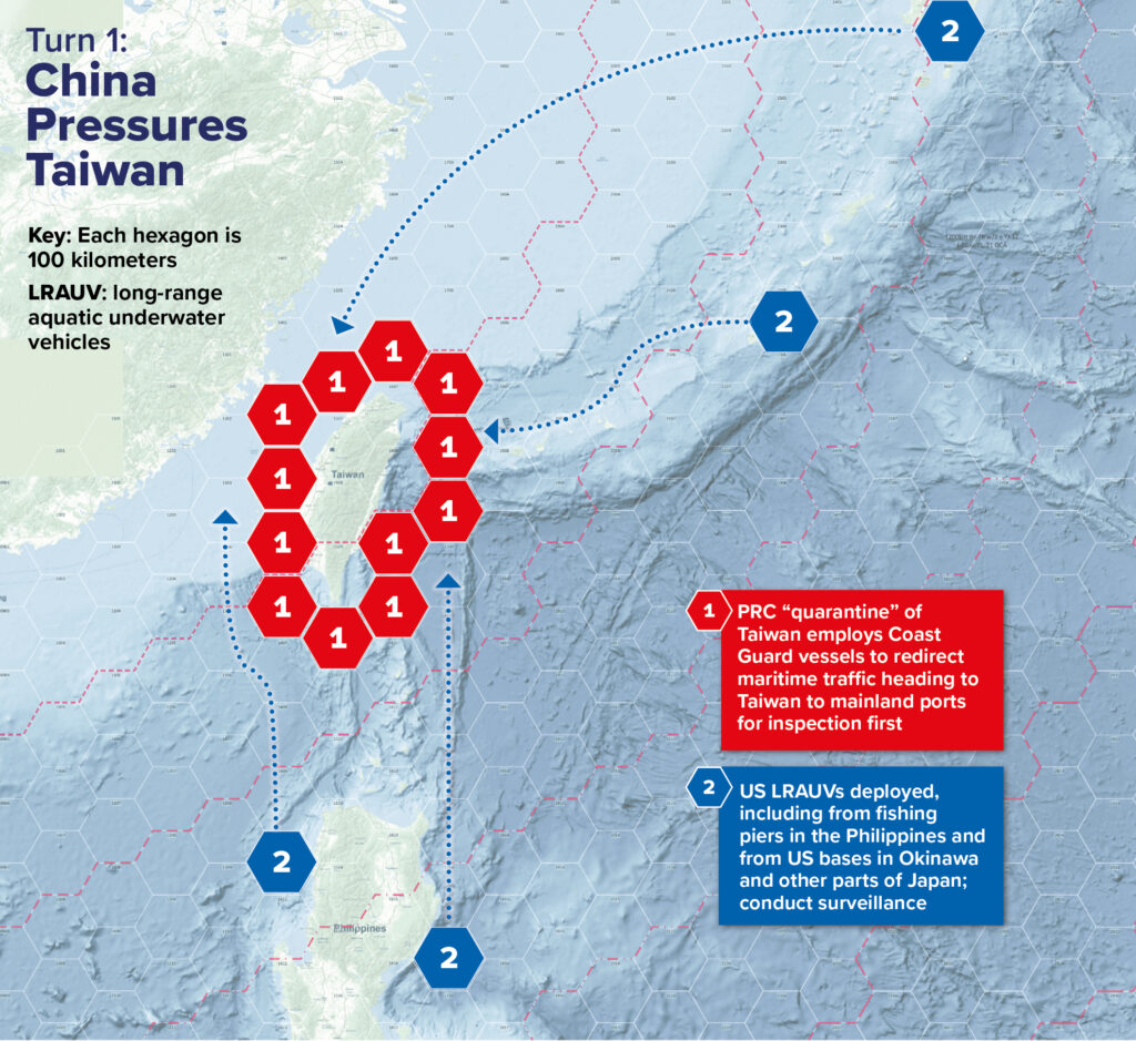 To explore LRAUVs’ potential in a near-future Taiwan scenario, we conducted the two-day Aquatic Tiger wargame with three teams including former US military, intelligence, and defense officials, along with non-government scholars and industry experts. The Blue Team representing the US military, including notional LRAUV capabilities, was led by a former US Defense Department senior executive with extensive experience with East Asian issues. The Red Team, representing China, was led by a former senior defense intelligence analyst whose career focused on China’s military. The control team planned and ran the wargame, adjudicated the results of player actions, and addressed the roles of countries other than the United States and China as needed. It consisted of former US government and military leaders with experience running wargames and tabletop exercises—including one retired US Navy officer with extensive experience directing wargames on undersea warfare—and a distinguished scholar bringing academic rigor to the analytic methodology.
