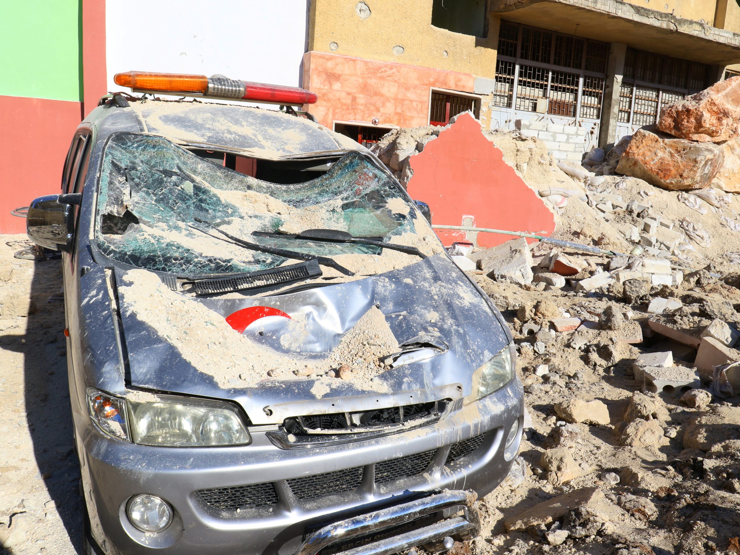 Image: A damaged ambulance and hospital are pictured at a site hit by overnight airstrike, in Kafr Takharim, northwest of Idlib city, Syria April 25, 2017. REUTERS/Ammar Abdullah