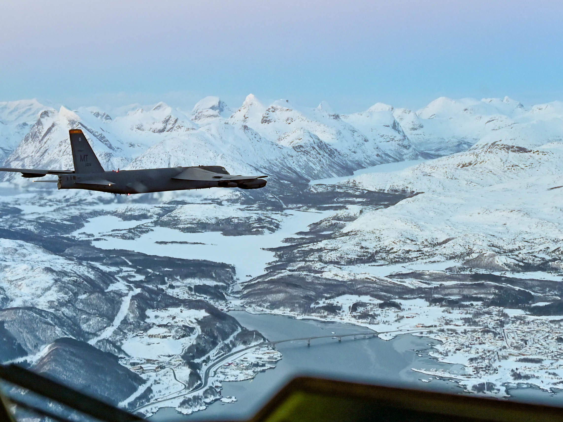 Image: A B-52H Stratofortress assigned to the 23rd Expeditionary Bomb Squadron flies over Norway during a Bomber Task Force mission March 16, 2023. Bomber Task Force missions demonstrate the credibility of our forces to address a global security environment that is more diverse and uncertain than at any other time in recent history. (U.S. Air Force photo by Senior Airman Zachary Wright)