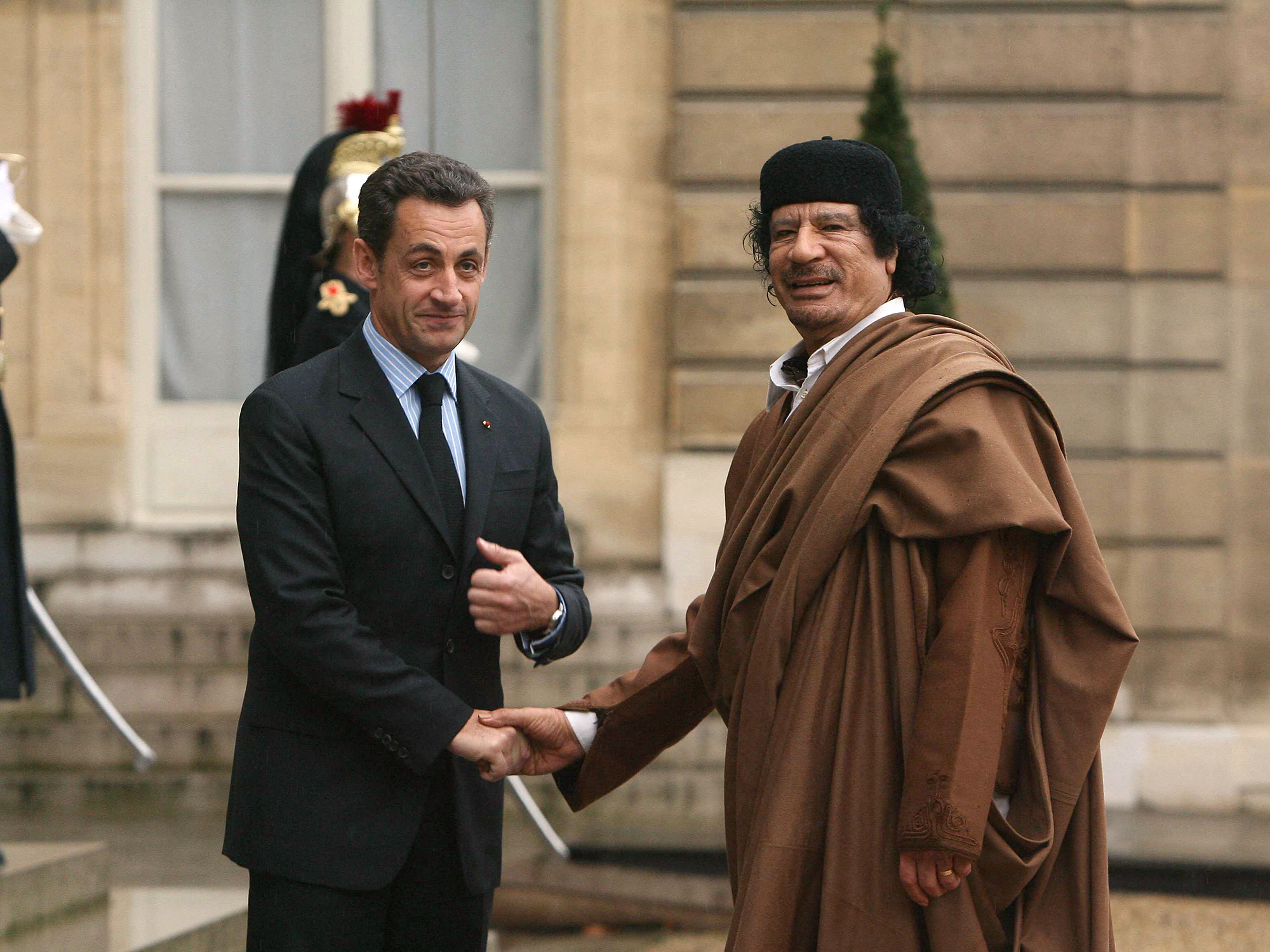 Image: President Sarkozy shakes hands with President al-Qaddafi before their meeting at the Elysee Palace in Paris on December 10, 2007.