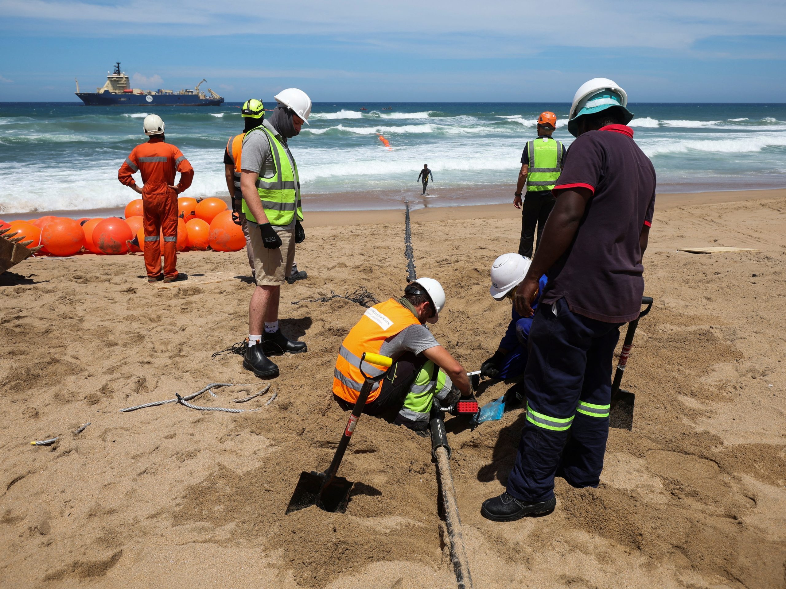 Image: Workers install the 2Africa undersea cable on the beach in Amanzimtoti, South Africa, February 7, 2023. REUTERS/Rogan Ward