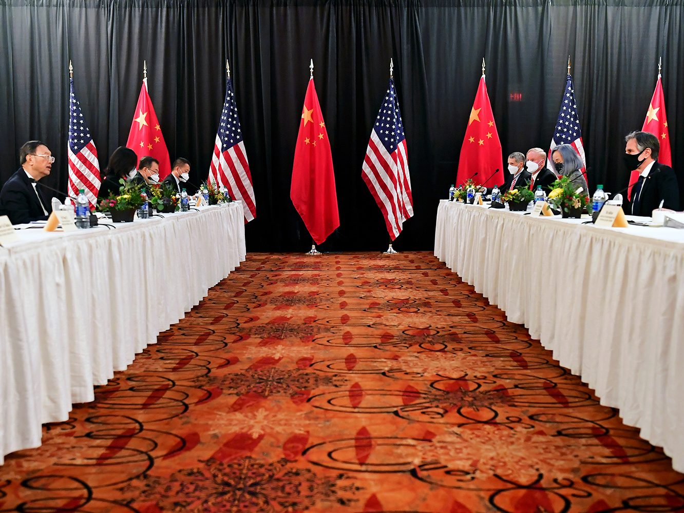Image: U.S. Secretary of State Antony Blinken, joined by National Security Advisor Jake Sullivan, speaks while facing Yang Jiechi, director of the Central Foreign Affairs Commission Office, and Wang Yi, China's State Councilor and Foreign Minister, at the opening session of US-China talks at the Captain Cook Hotel in Anchorage, Alaska, U.S. March 18, 2021. Frederic J. Brown/Pool via REUTERS
