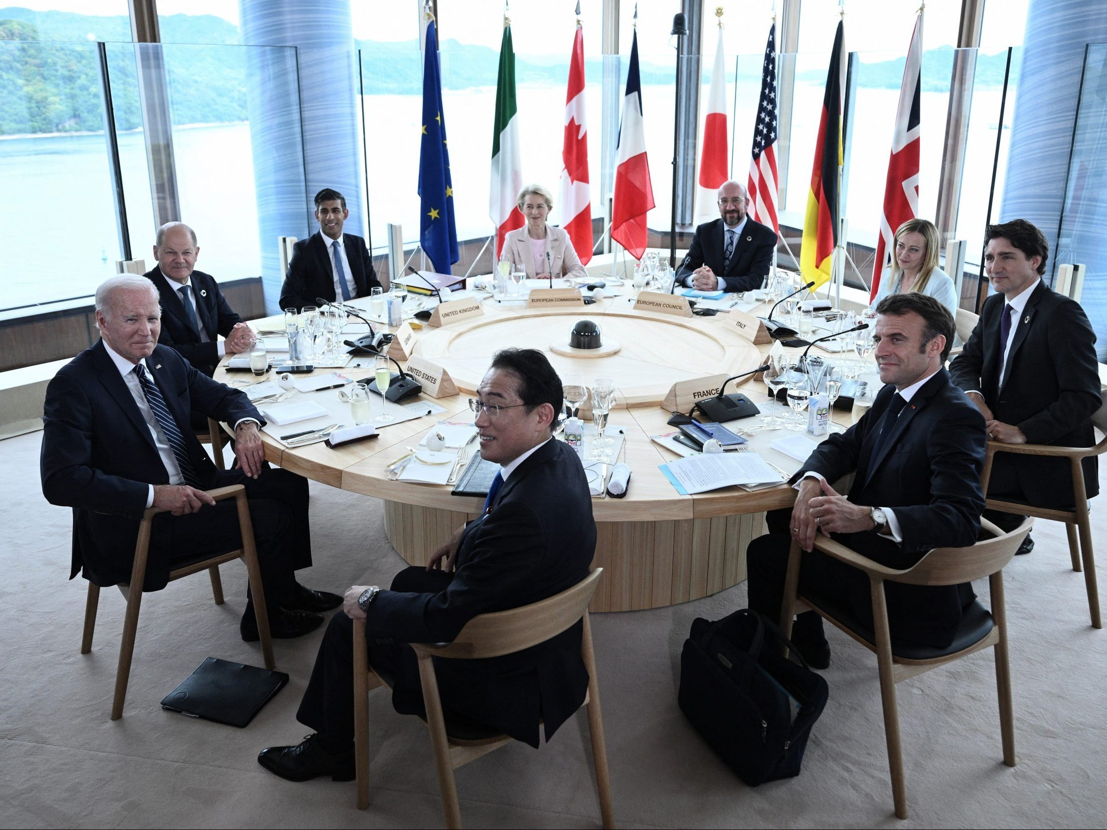 Image: US President Joe Biden, Germany's Chancellor Olaf Scholz, Britain's Prime Minister Rishi Sunak, European Commission President Ursula von der Leyen, President of the European Council Charles Michel, Italy's Prime Minister Giorgia Meloni, Canada's Prime Minister Justin Trudeau, France's President Emmanuel Macron and Japan's Prime Minister Fumio Kishida attend a meeting during the G7 Leaders' Summit in Hiroshima on May 19, 2023. BRENDAN SMIALOWSKI/Pool via REUTERS