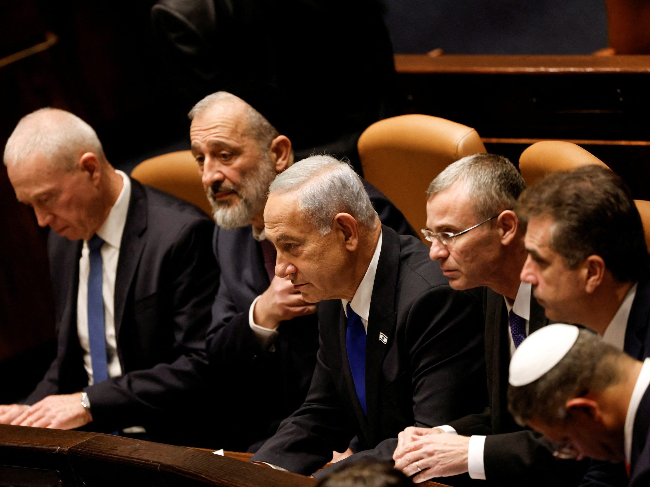 Image: Israeli Prime Minister Benjamin Netanyahu and members of his new right-wing government look on as the government is sworn in at the Knesset, Israel's parliament in Jerusalem December 29, 2022. REUTERS/Amir Cohen/Pool