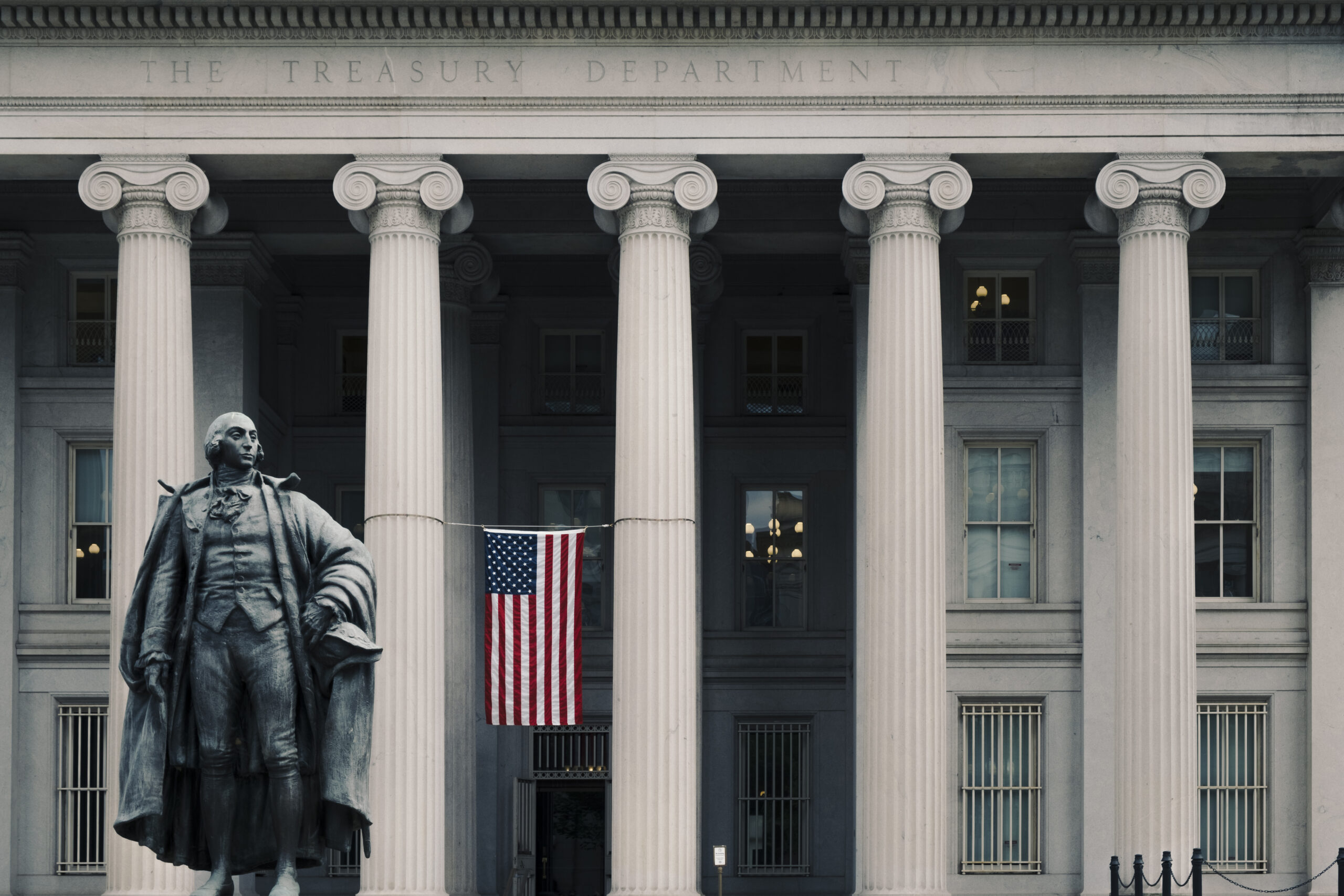 Image: The Albert Gallatin statue is pictured in front of the northern entrance to the United States Treasury Building, Washington DC. | iStock via Flory