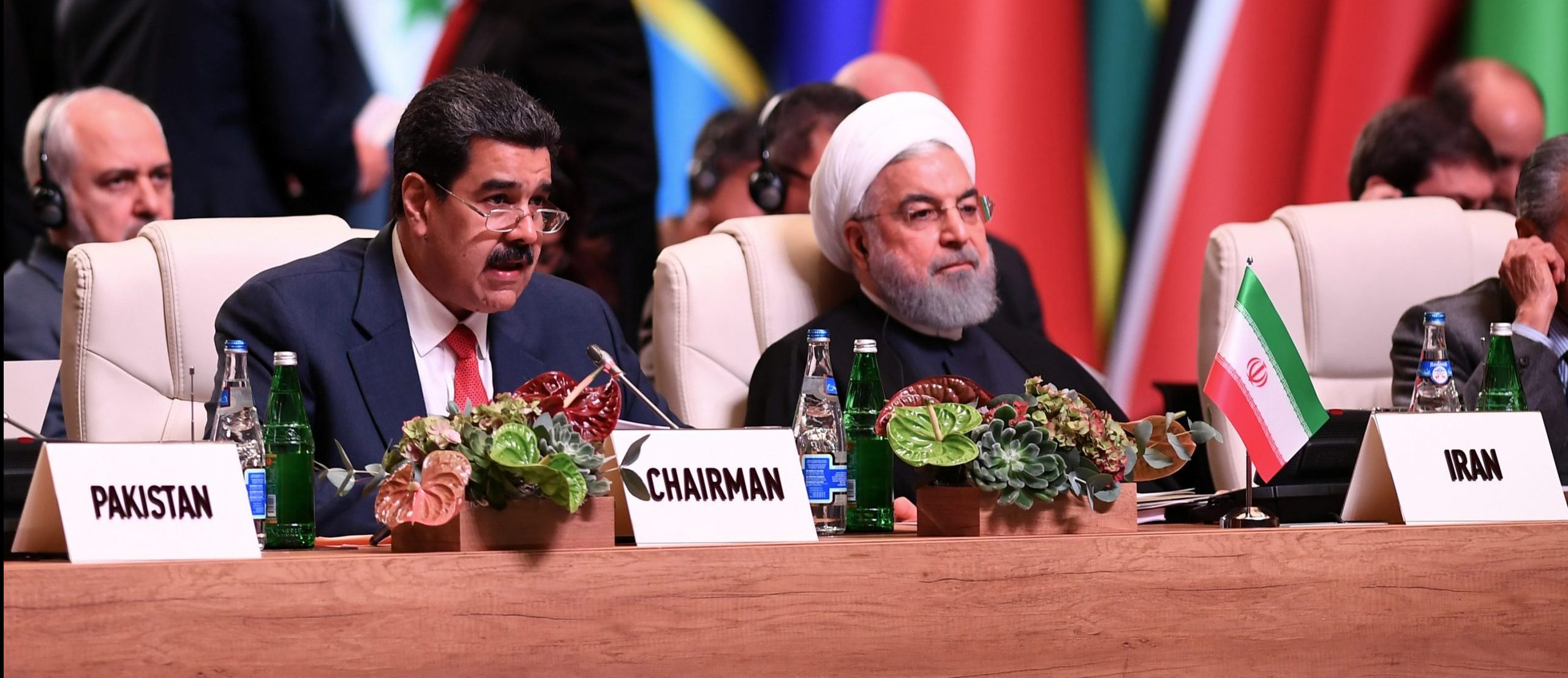 Image: Venezuela’s Nicolás Maduro next to Iranian President Hassan Rouhani during the 18th Summit of Heads of State and Government of the Non-Aligned Movement in Baku, Azerbaijan. Iran-backed Hezbollah operates clandestine networks of clans in Venezuela with financiers, fixers, and facilitators connected to the Maduro regime. Picture taken on October 25, 2019.