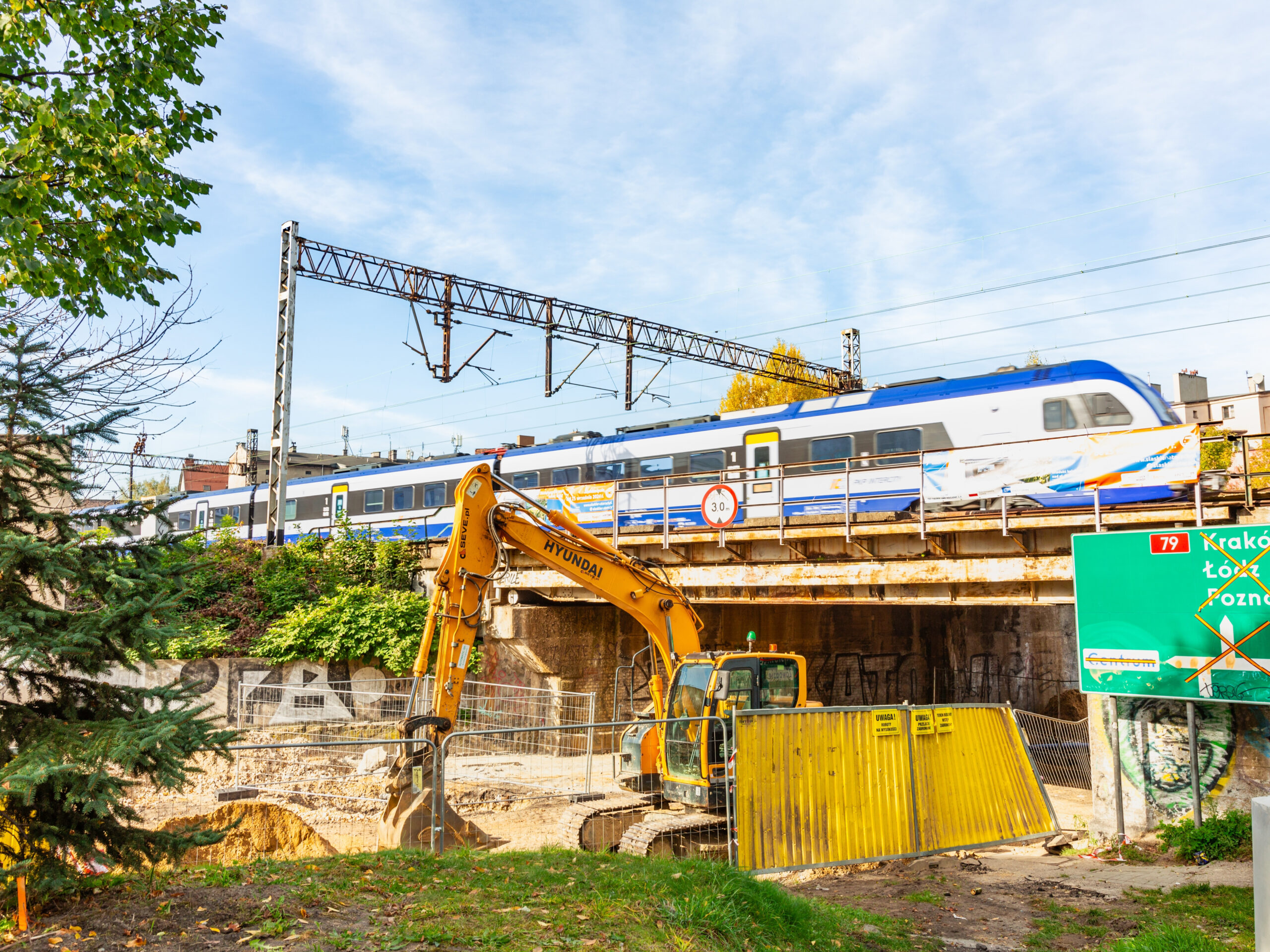 Image: Katowice , Poland. October 20, 2024: PKP. Modernization of the E65 railroad line. Reconstruction of the viaduct over Graniczna Street. Investment from european funds.