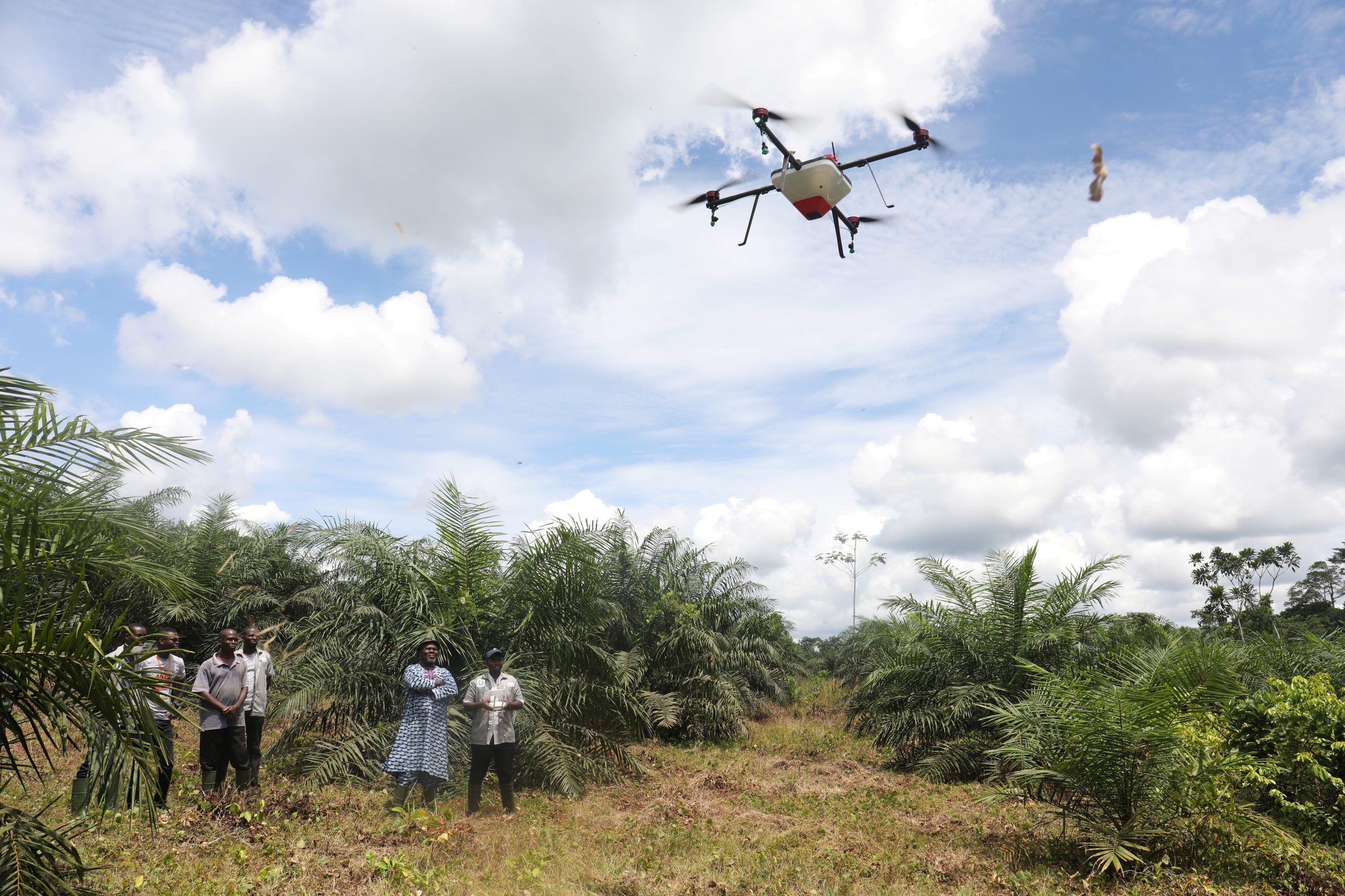 Image: Emmanuel Adou, an Ivorian farmer, watches a drone spraying crops May 21, 2019. REUTERS/Luc Gnago
