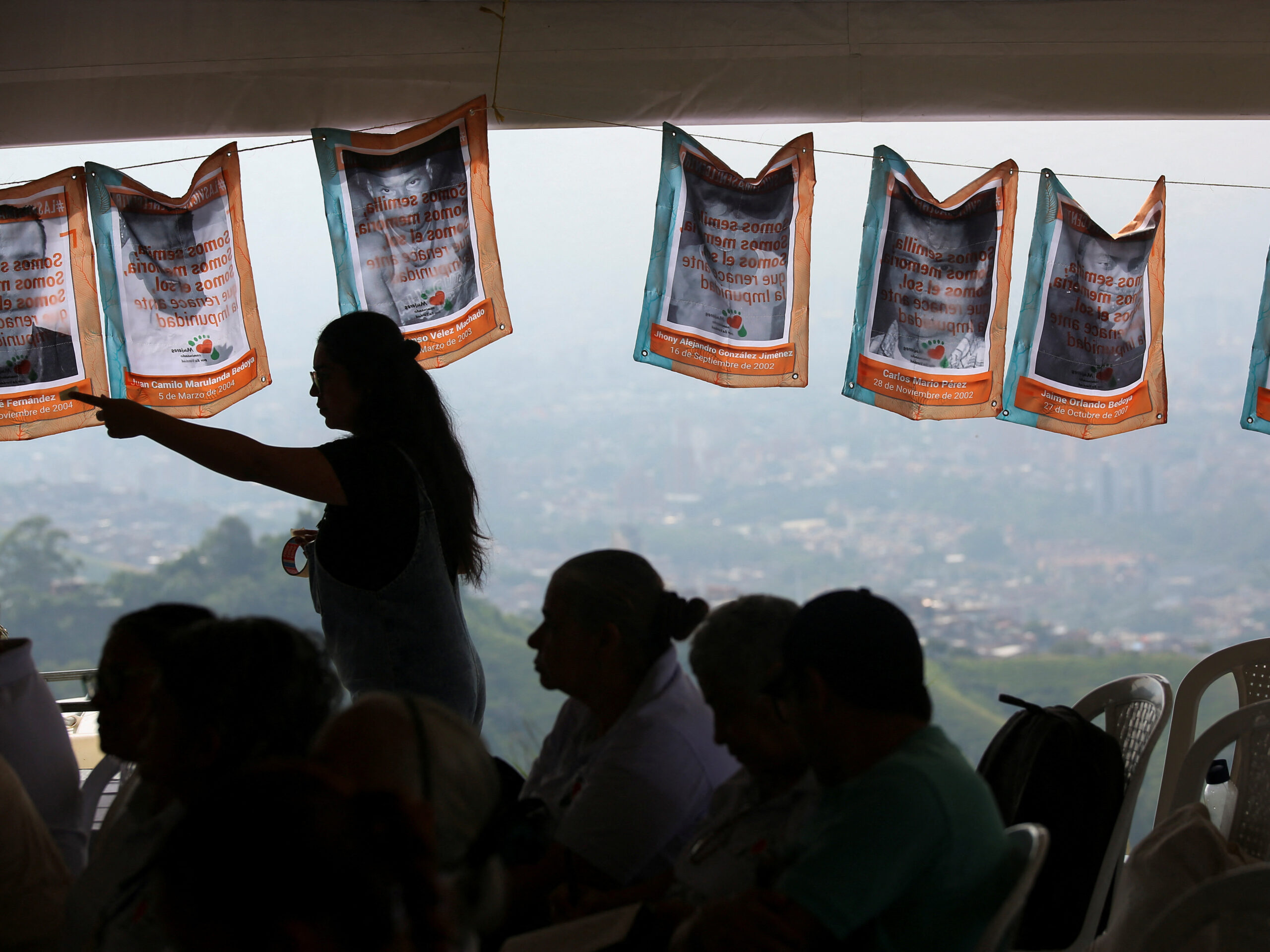 Image: Family members gather by photographs of their missing loved ones, as the Special Jurisdiction for Peace (JEP) and the Unit for the Search for Disappeared Persons (UBPD) resume the search for the remains of people authorities suspect were killed between 1999 and 2004 by guerrillas and paramilitaries who dumped their bodies amid tons of rubble, in Medellin, Colombia July 26, 2024. REUTERS/Juan David Duque