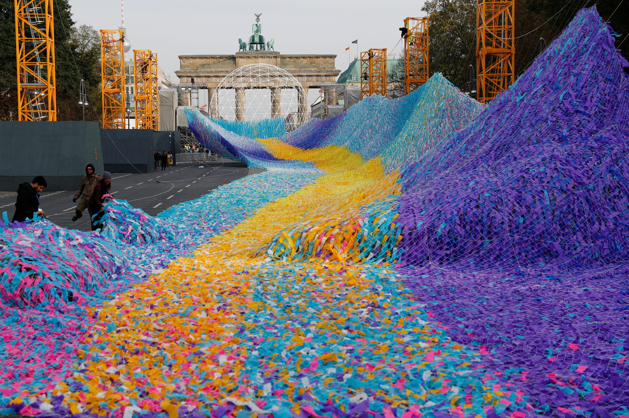 Image: Image: Workers make final preparation to raise up the art installation "Visions in Motion" at Brandenburg Gate in Berlin, Germany, November 1, 2019. REUTERS/Fabrizio Bensch