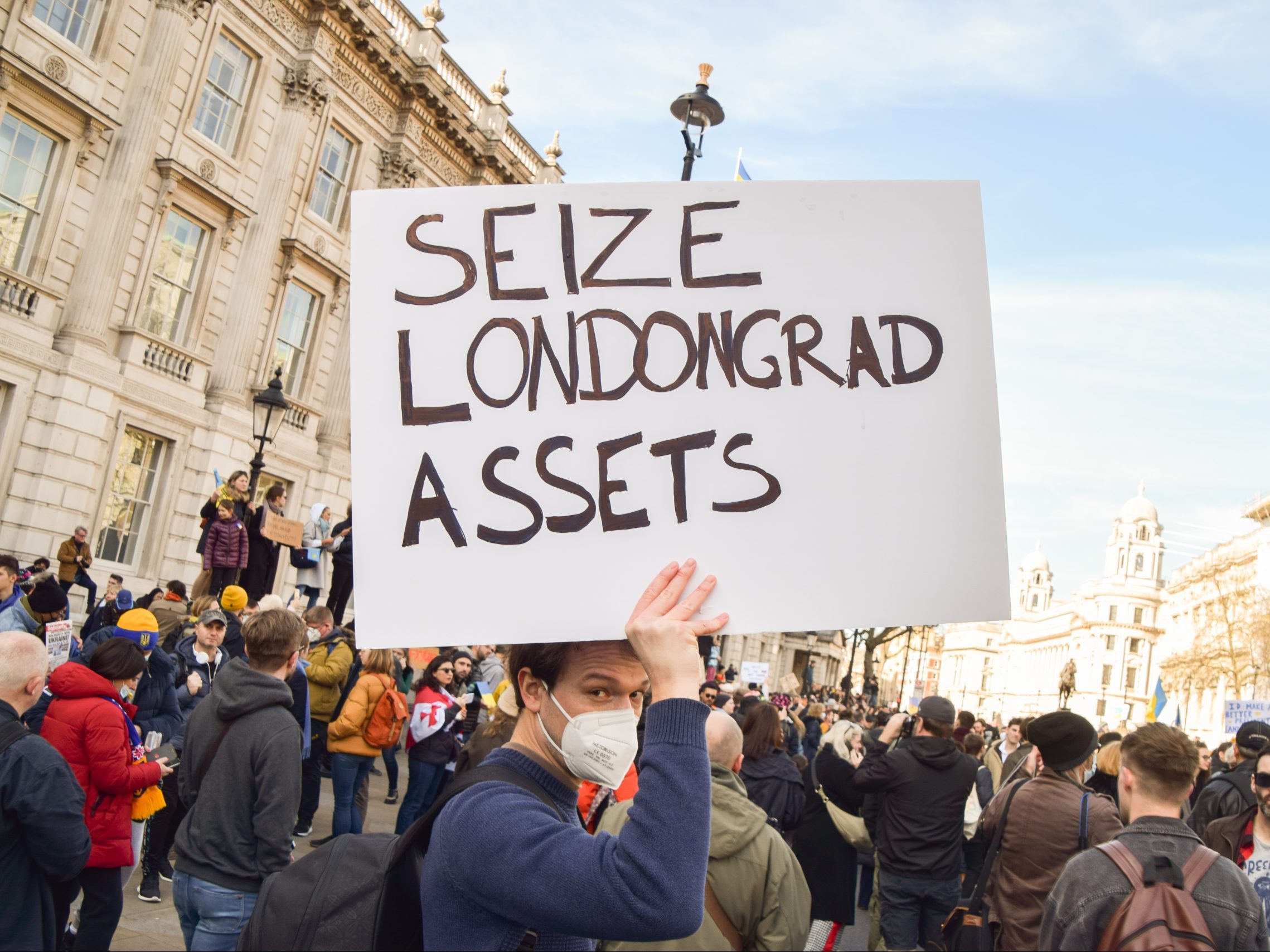 Image: A protester holds a 'Seize Londongrad Assets' placard during the demonstration. Thousands of people gathered in Whitehall in protest against the Russian invasion of Ukraine, and called on the UK Government and NATO to help Ukraine. (Photo by Vuk Valcic / SOPA Images/Sipa USA)No Use Germany.