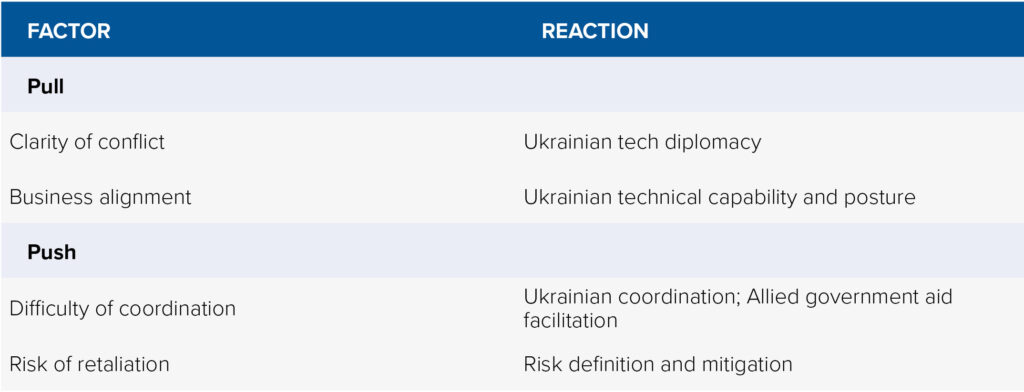 This study examines the characteristics of this conflict that influenced companies’ decision-making regarding the type and degree of their involvement in Ukraine. Which factors and actions taken by states shaped tech companies’ decisions throughout the conflict as to whether and how to lend their support to Ukraine? These include both pull factors, those that increased the likeliness and degree of technology company involvement in Ukraine, and push factors, those that decreased the likeliness or degree of the same. Additionally, a key element influencing this space was the response by the Ukrainian government, allied governments, and international bodies to either build on the effects of the pull factors or mitigate the effects of the push factors throughout the conflict.