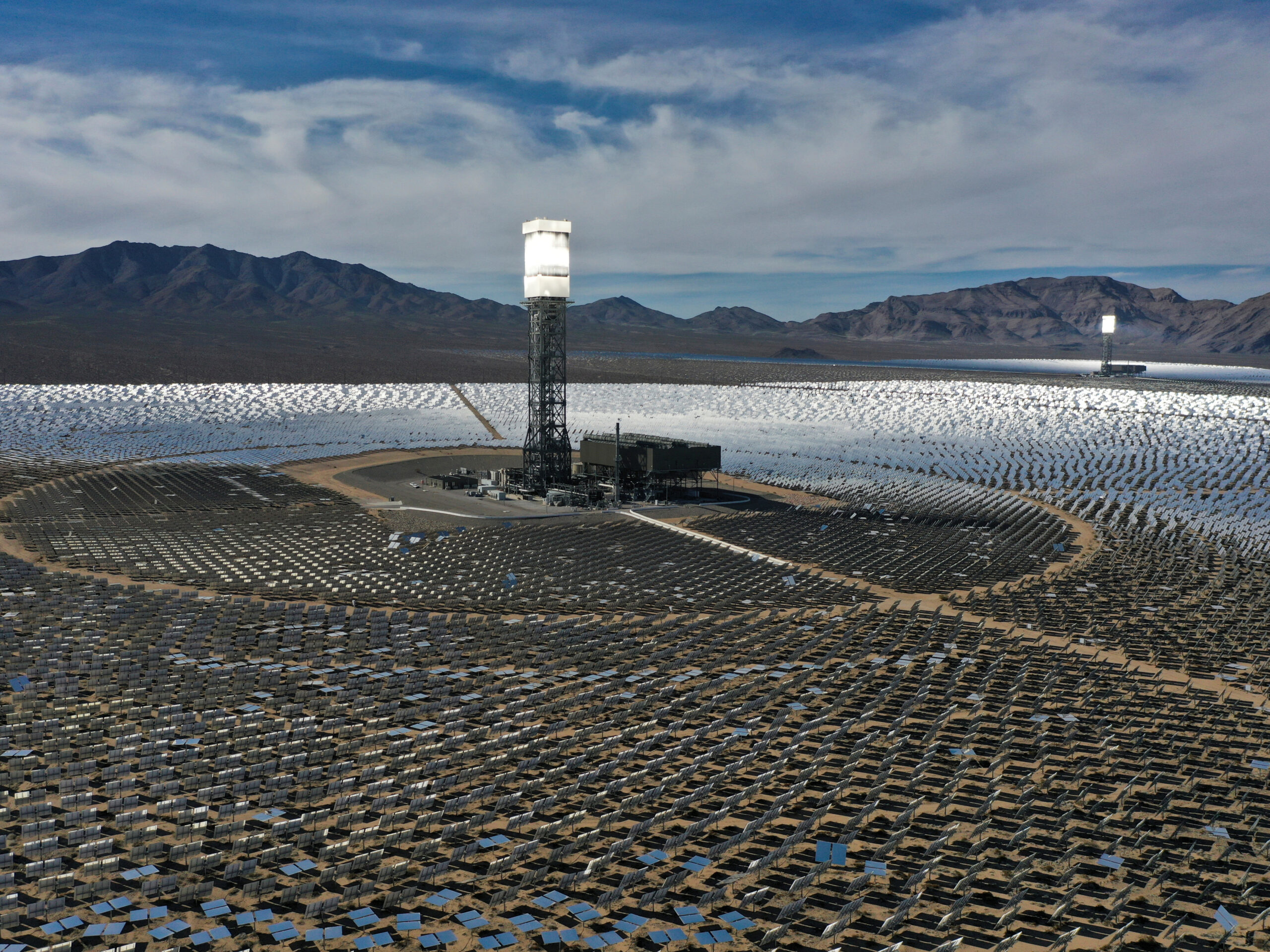 Image: Fields of heliostat mirrors reflect sunlight onto a boiler mounted onto solar power towers at the Ivanpah Solar Electric Generating System, the world’s largest solar thermal power station, in the Mojave Desert near Nipton, California U.S., February 27, 2022. Picture taken with a drone on February 27, 2022. REUTERS/Bing Guan