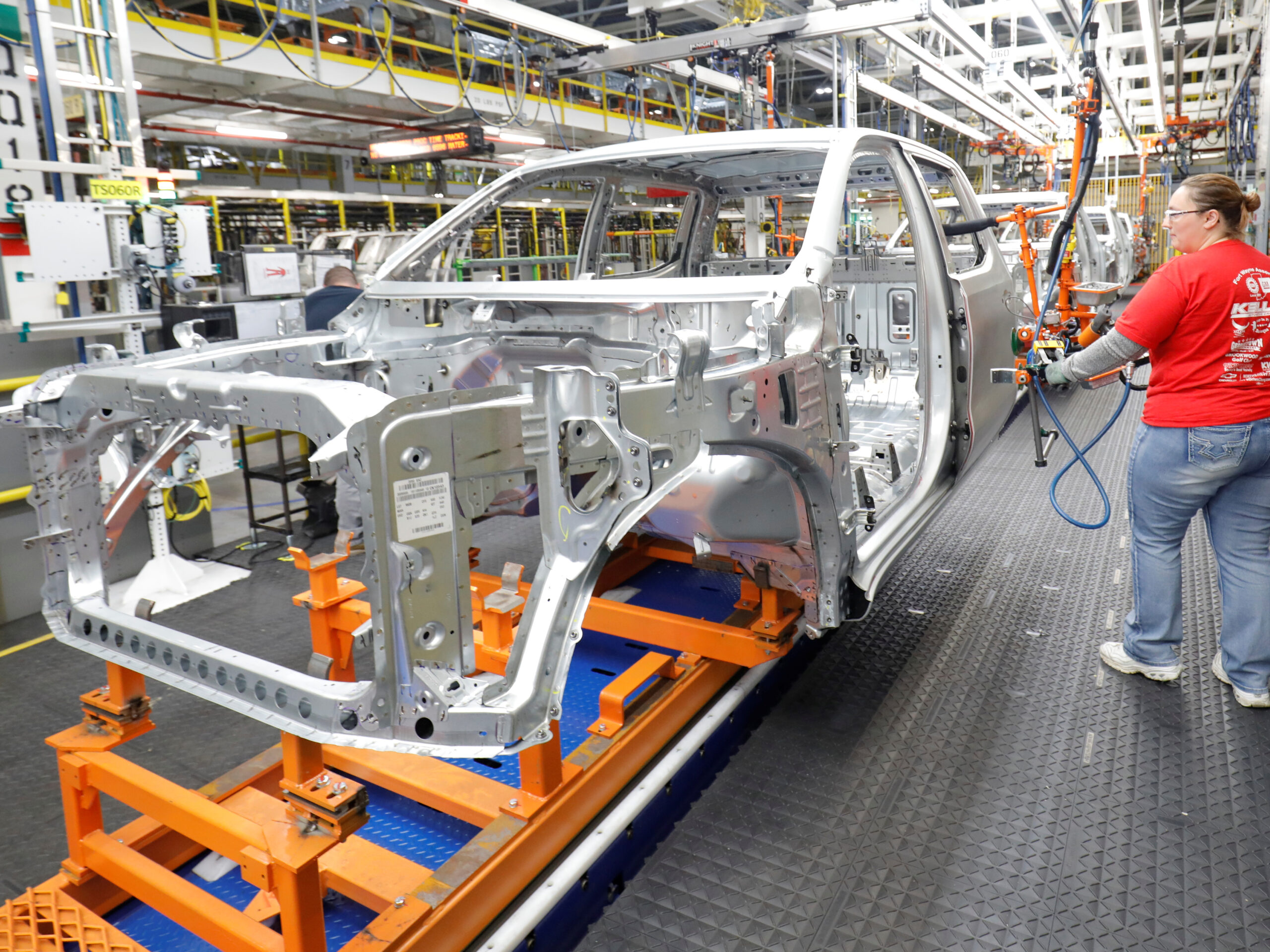Image: A worker attaches a steel and aluminum door at GM's Chevrolet Silverado and GMC Sierra pickup truck plant in Fort Wayne, Indiana, July 25, 2018. GM-SILVERADO/ REUTERS/John Gress.
