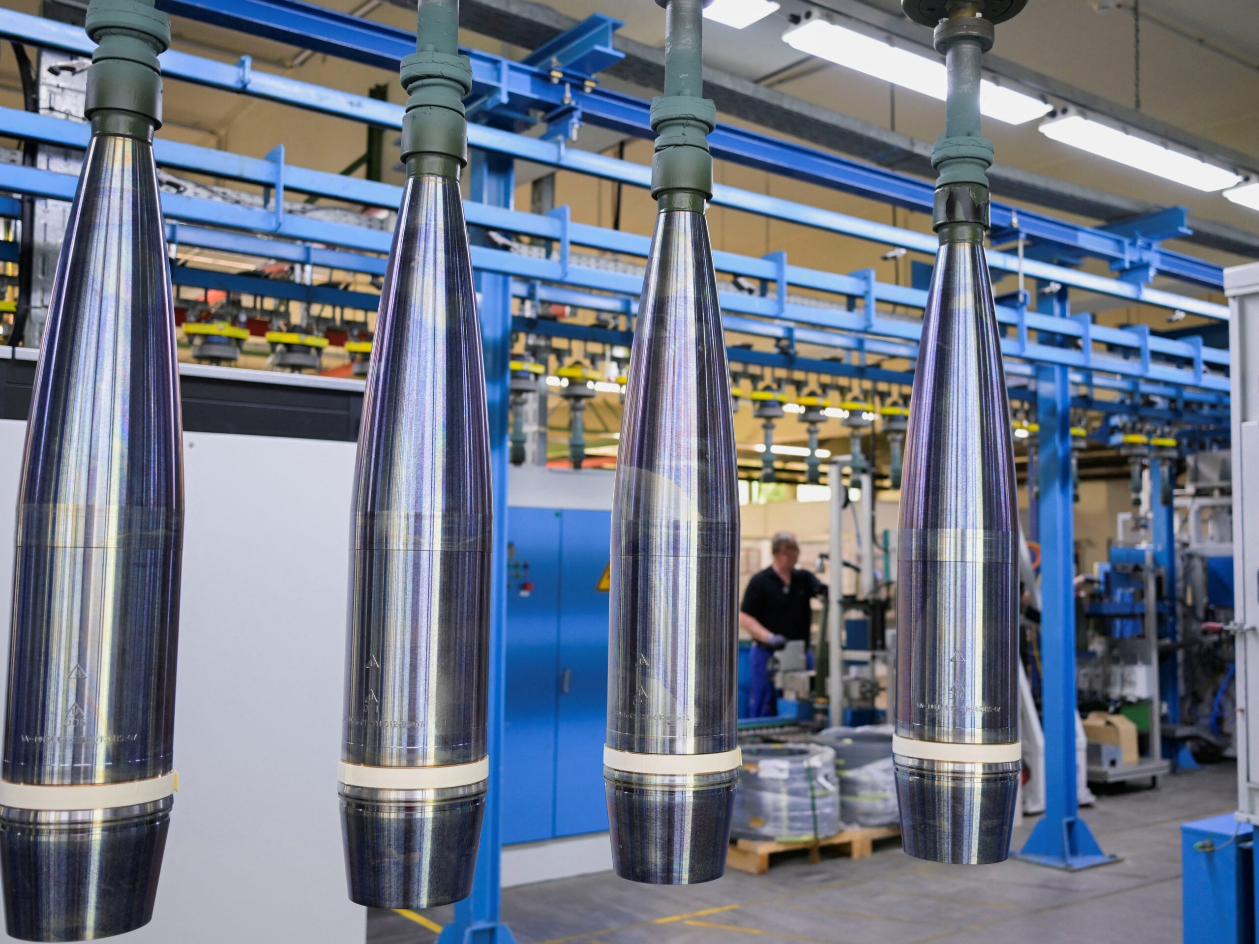 Image: An employee works at a production line of 155 mm artillery shells at the plant of German company Rheinmetall, which produces weapons and ammunition for tanks and artillery, during a media tour in Unterluess, Germany, June 6, 2023. REUTERS/Fabian Bimmer.