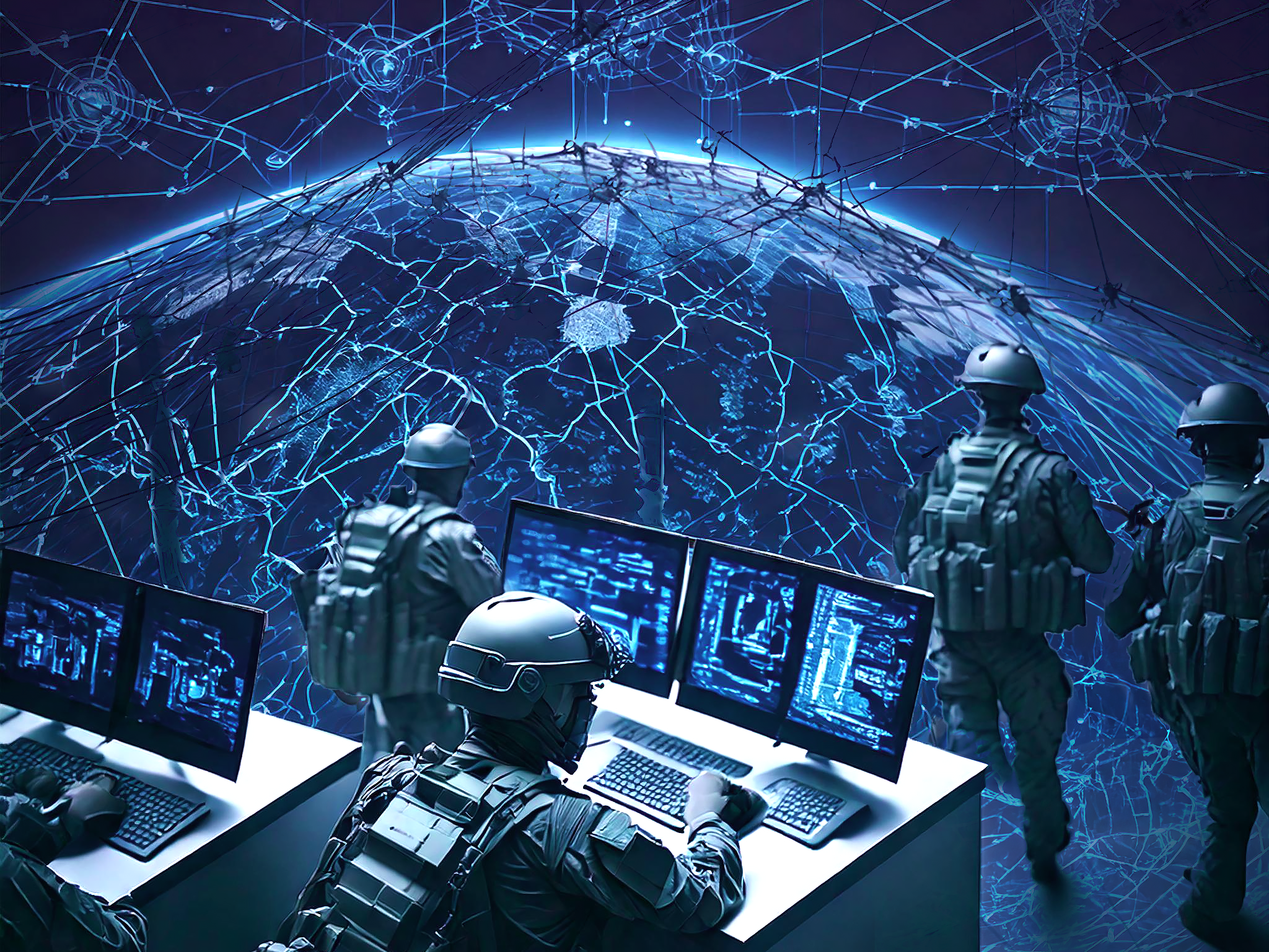 Prompt: Design an abstract image for a report on special operations forces, highlighting global situational awareness, strategic partnerships, technological innovation, and multi-domain integration. Use subtle military motifs and interconnected lines to convey resilience, influence, and modern strategy, and show special operators. Opt for a sleek, authoritative color palette with deep blues, grays, and metallics.