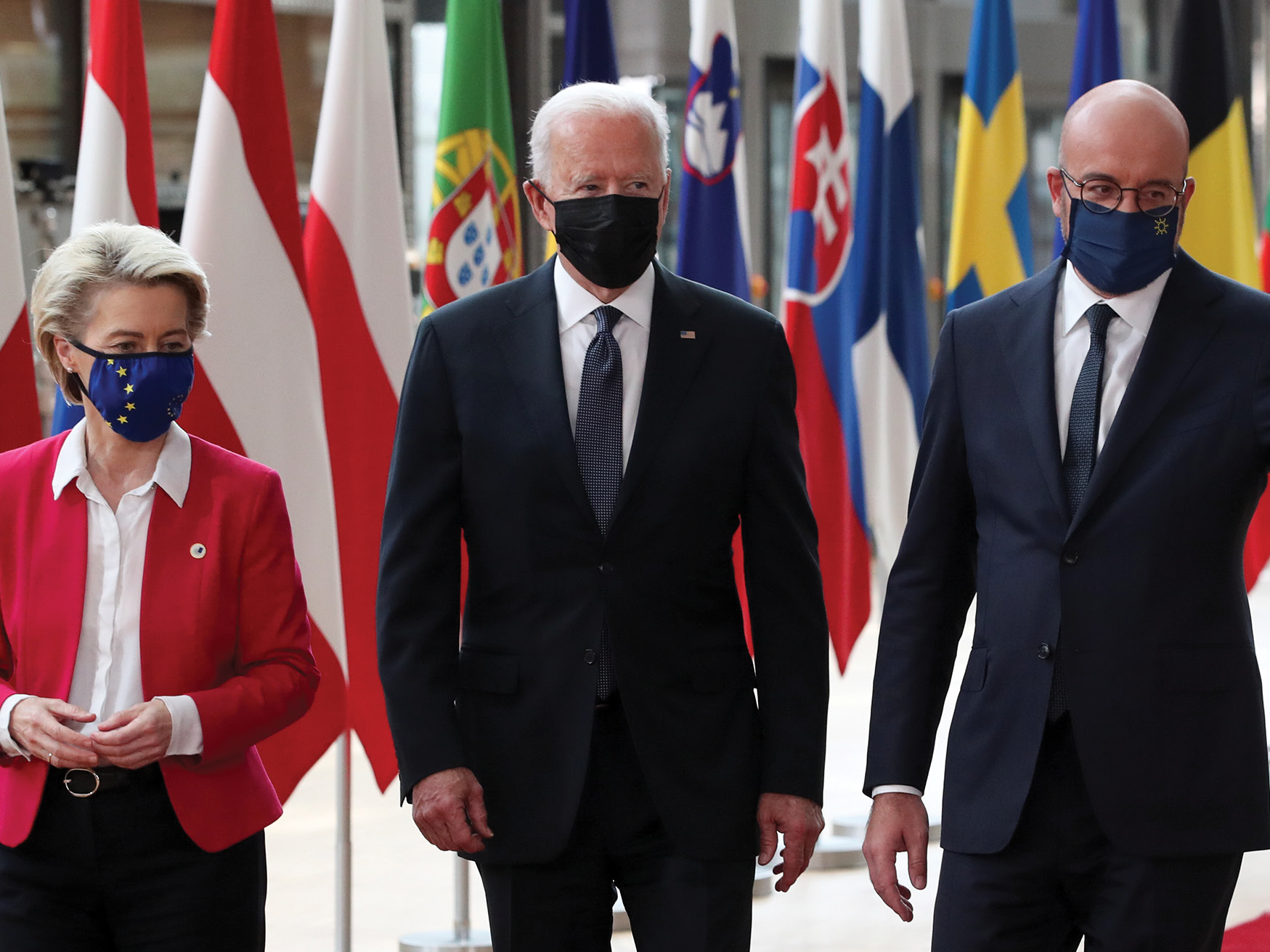 Image: U.S. President Joe Biden, European Council President Charles Michel and European Commission President Ursula von der Leyen attend the EU-US summit, in Brussels, Belgium June 15, 2021. REUTERS/Yves Herman. [RTXDAG3T]