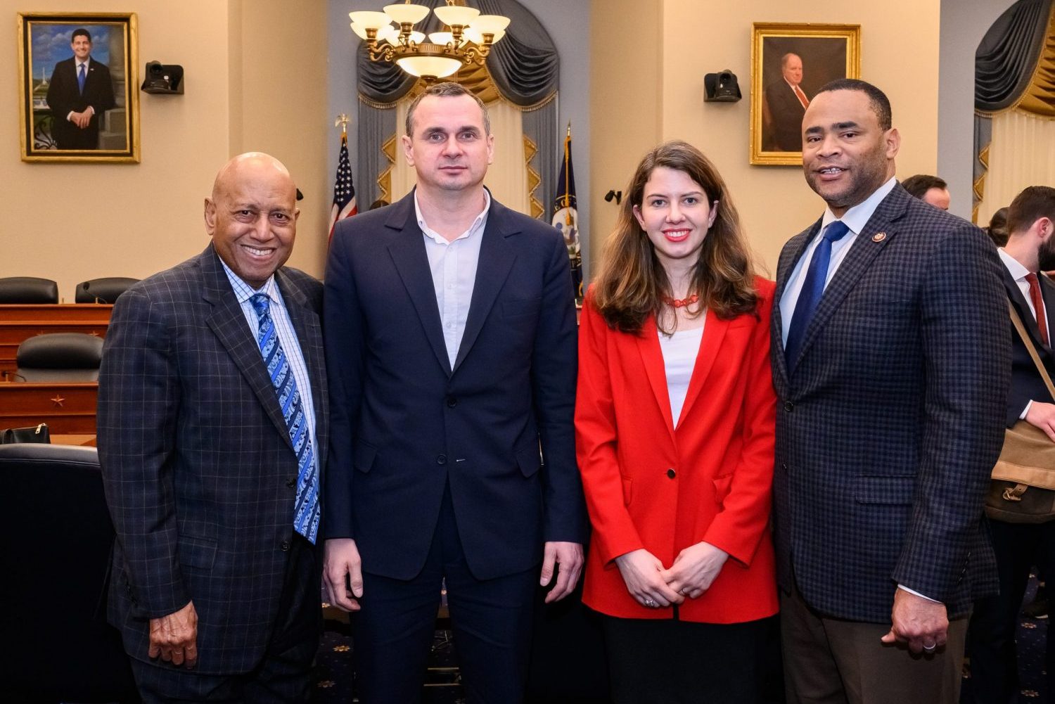 Image: Left to right: Representative Alcee L. Hastings (D-FL), Oleg Sentsov, Melinda Haring, and Representative Marc Veasey (D-TX). Photo Credit: Commission for Security and Cooperation in Europe.